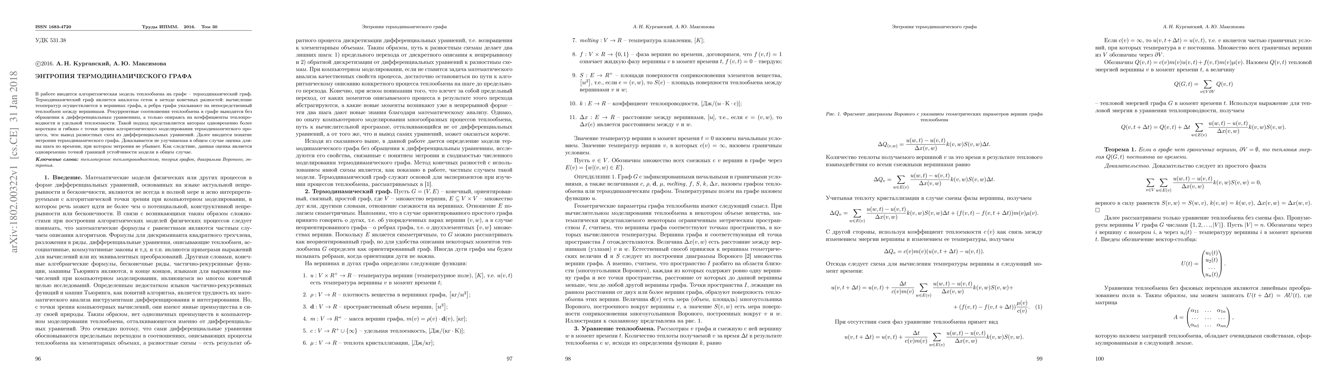 We introduce an algorithmic model of heat conduction, the thermodynamic graph. The thermodynamic graph is analogous to meshes in the finite difference method in the sense that the calculation of temperature is carried out at the vertices of the graph, and the edges indicate the direct heat exchange between the vertices. Recurrence relations of heat conduction in graph are derived without using of differential equations and based on the coefficients of thermal conductivity and heat capacity. This approach seems to be more direct and flexible from the point of view of algorithmic modeling of thermodynamic process than the derivation of difference schemes from differential equations. We introduce also the notion of entropy of thermodynamic graph. We find the maximum length of the time step at which the entropy does not decrease in the general case. As a result, this give us the accurate boundary of the model stability.