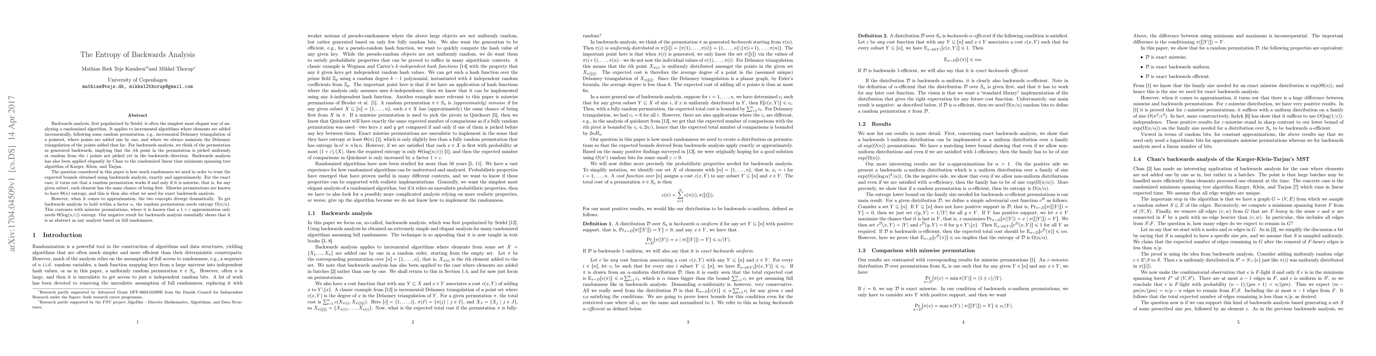 The paper formally characterizes the entropy requirements for exact and approximate backwards analysis, distinguishing between minwise permutations and the broader class of random permutations necessary for different approximation factors.