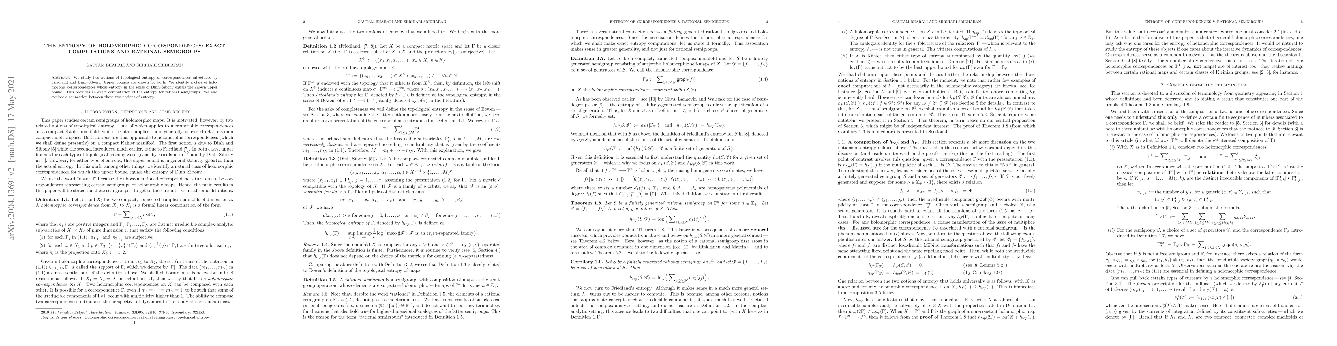 This paper computes the entropy of holomorphic correspondences for rational semigroups, showing it equals known upper bounds, and explores connections between two entropy notions introduced by Friedland and Dinh-Sibony.