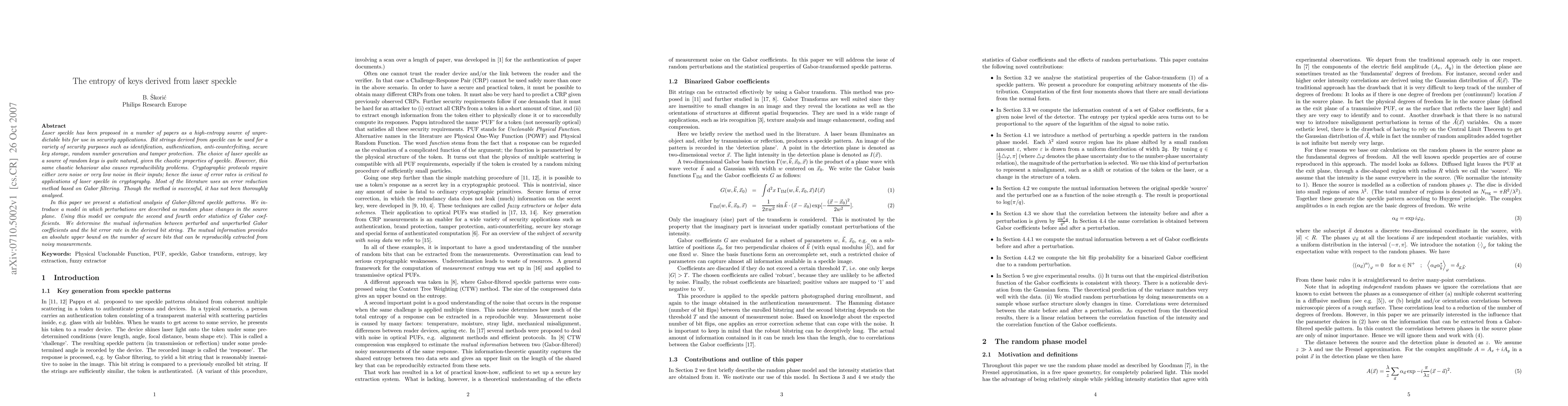 Laser speckle has been proposed in a number of papers as a high-entropy source of unpredictable bits for use in security applications. Bit strings derived from speckle can be used for a variety of security purposes such as identification, authentication, anti-counterfeiting, secure key storage, random number generation and tamper protection. The choice of laser speckle as a source of random keys is quite natural, given the chaotic properties of speckle. However, this same chaotic behaviour also causes reproducibility problems. Cryptographic protocols require either zero noise or very low noise in their inputs; hence the issue of error rates is critical to applications of laser speckle in cryptography. Most of the literature uses an error reduction method based on Gabor filtering. Though the method is successful, it has not been thoroughly analysed. In this paper we present a statistical analysis of Gabor-filtered speckle patterns. We introduce a model in which perturbations are described as random phase changes in the source plane. Using this model we compute the second and fourth order statistics of Gabor coefficients. We determine the mutual information between perturbed and unperturbed Gabor coefficients and the bit error rate in the derived bit string. The mutual information provides an absolute upper bound on the number of secure bits that can be reproducibly extracted from noisy measurements.