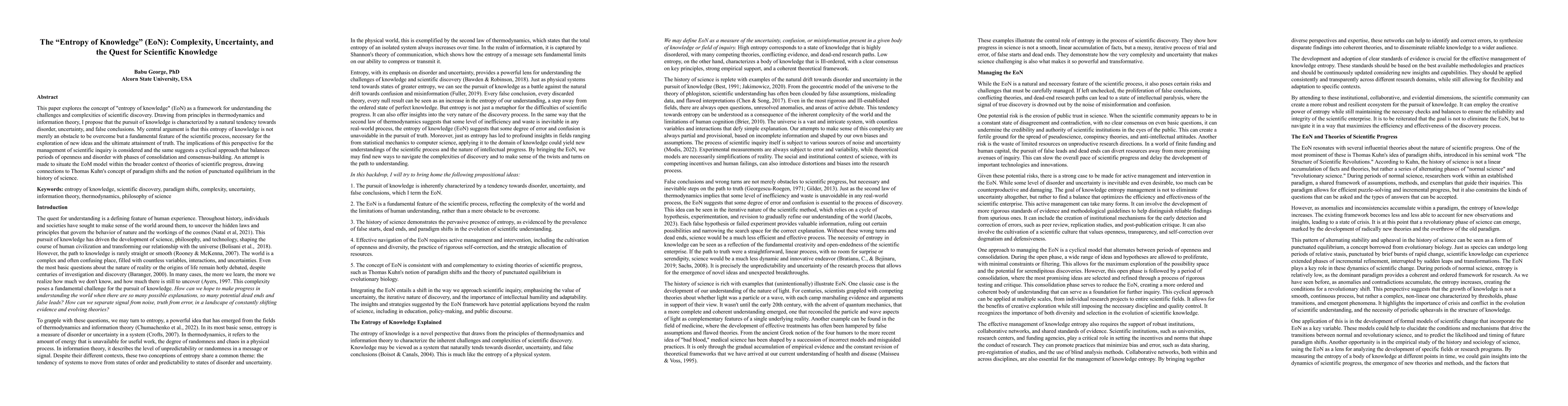 This paper explores the concept of "entropy of knowledge" (EoN) as a framework for understanding the challenges and complexities of scientific discovery. Drawing from principles in thermodynamics and information theory, I propose that the pursuit of knowledge is characterized by a natural tendency towards disorder, uncertainty, and false conclusions. My central argument is that this entropy of knowledge is not merely an obstacle to be overcome but a fundamental feature of the scientific process, necessary for the exploration of new ideas and the ultimate attainment of truth. The implications of this perspective for the management of scientific inquiry is considered and the same suggests a cyclical approach that balances periods of openness and disorder with phases of consolidation and consensus-building. An attempt is made to situate the EoM model within the broader context of theories of scientific progress, drawing connections to Thomas Kuhn's concept of paradigm shifts and the notion of punctuated equilibrium in the history of science.