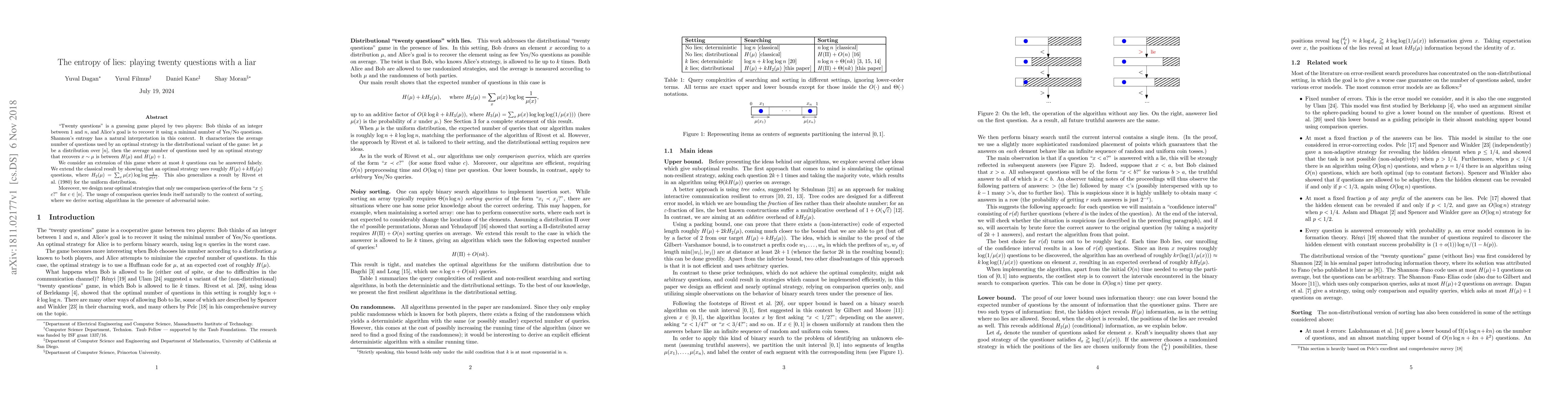 This paper explores a variant of the "twenty questions" game where Alice can ask up to $k$ false questions. It shows that an optimal strategy requires roughly $H(\mu) + k H_2(\mu)$ questions, where $H_2(\mu)$ measures the entropy of the distribution over possible numbers. The study also designs near-optimal strategies using comparison queries, leading to sorting algorithms tolerant to adversarial noise.