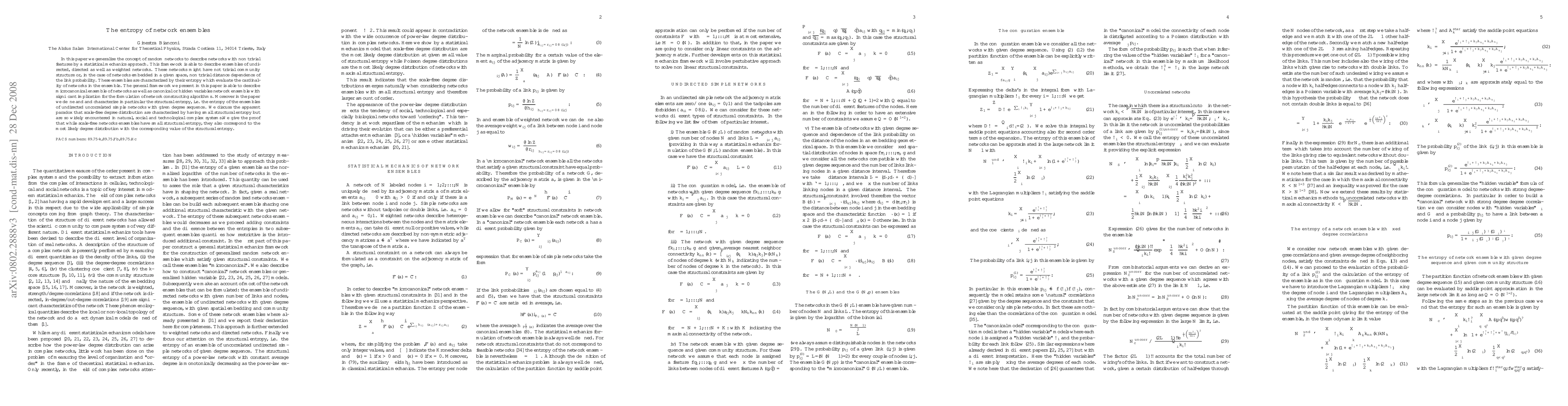 In this paper we generalize the concept of random networks to describe networks with non trivial features by a statistical mechanics approach. This framework is able to describe ensembles of undirected, directed as well as weighted networks. These networks might have not trivial community structure or, in the case of networks embedded in a given space, non trivial distance dependence of the link probability. These ensembles are characterized by their entropy which evaluate the cardinality of networks in the ensemble. The general framework we present in this paper is able to describe microcanonical ensemble of networks as well as canonical or hidden variables network ensemble with significant implication for the formulation of network constructing algorithms. Moreover in the paper we define and and characterize in particular the "structural entropy", i.e. the entropy of the ensembles of undirected uncorrelated simple networks with given degree sequence. We discuss the apparent paradox that scale-free degree distribution are characterized by having small structural entropy but are so widely encountered in natural, social and technological complex systems. We give the proof that while scale-free networks ensembles have small structural entropy, they also correspond to the most likely degree distribution with the corresponding value of the structural entropy.