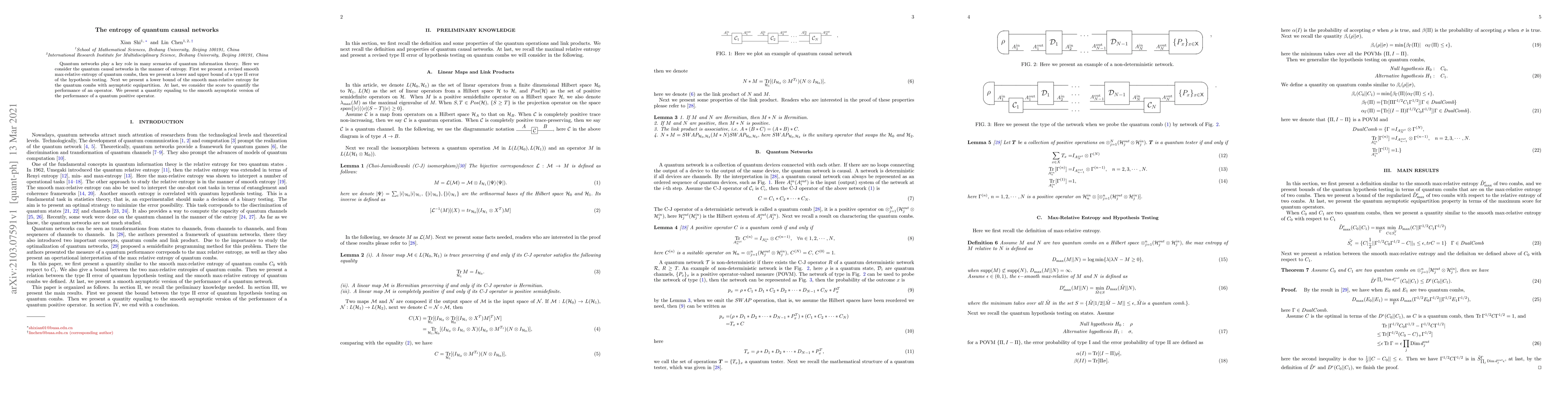 This paper investigates the entropy of quantum causal networks, focusing on revised smooth max-relative entropy of quantum combs and bounds for type II errors in hypothesis testing. It also presents a lower bound for smooth max-relative entropy in quantum combs with asymptotic equipartition and introduces a score to quantify the performance of quantum operators.