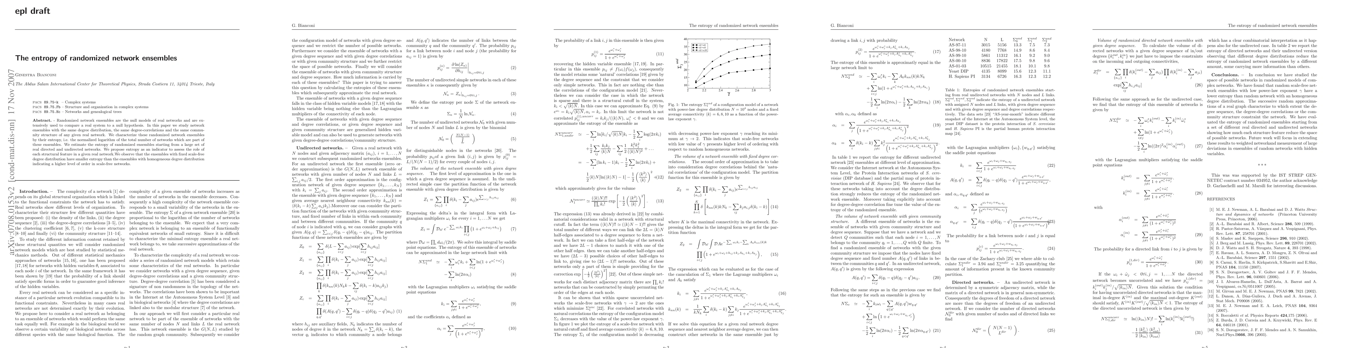 This paper investigates the entropy of randomized network ensembles, which serve as null models for comparing real networks. The authors find that scale-free networks exhibit lower entropy than those with a homogeneous distribution, suggesting a higher level of order in scale-free structures.