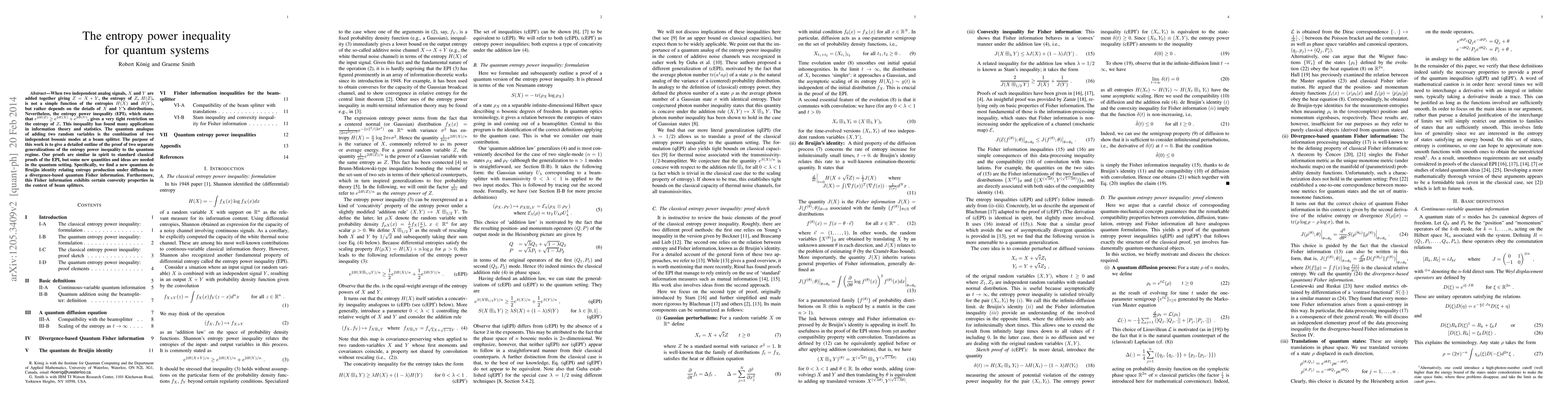 This paper generalizes the classical entropy power inequality to quantum systems, proving two versions in the context of combining independent bosonic modes at a beam splitter. It introduces a new quantum de Bruijn identity and a divergence-based quantum Fisher information, highlighting its convexity properties.