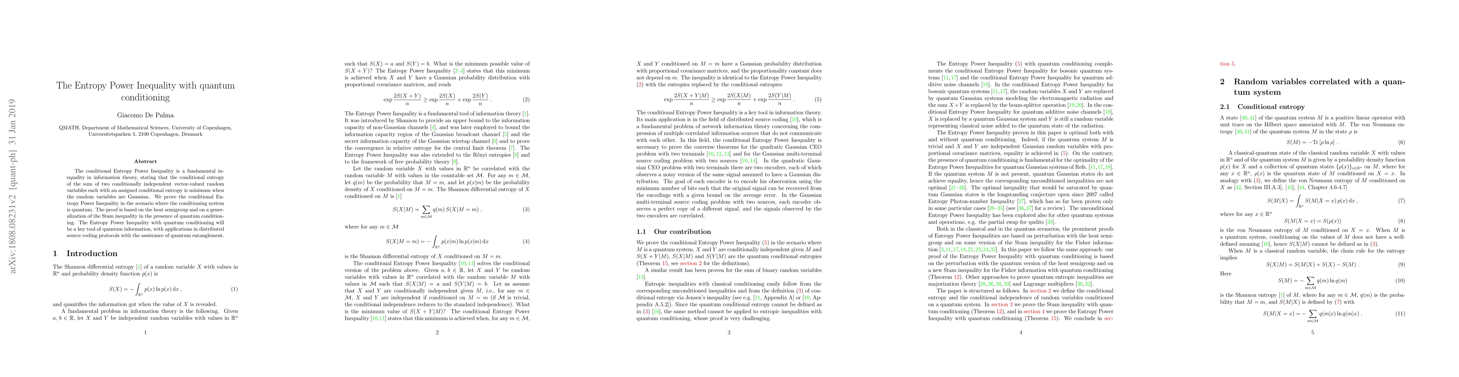 The paper proves the conditional entropy power inequality for quantum-conditioned systems using the heat semigroup and a generalized Stam inequality. This result will be crucial for quantum information theory, particularly in quantum distributed source coding protocols leveraging quantum entanglement.