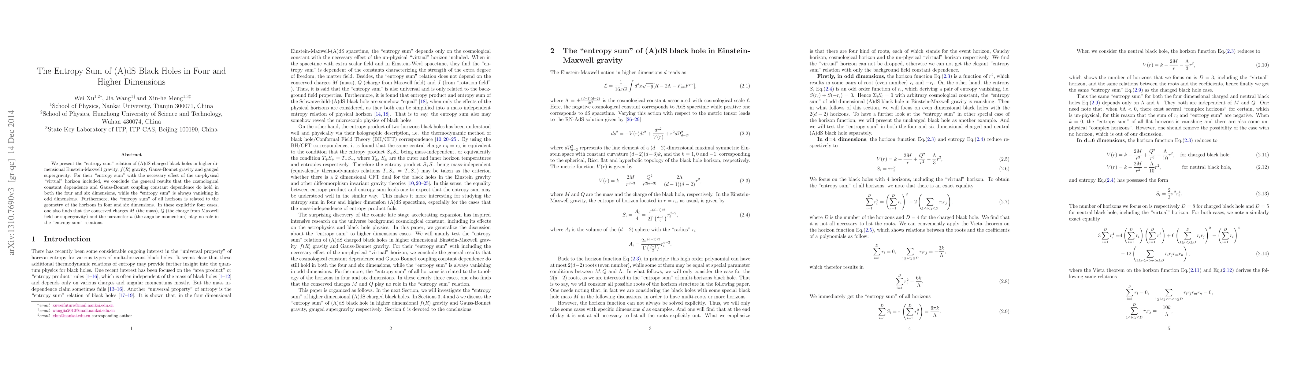This paper explores the "entropy sum" relation for (A)dS charged black holes in various higher-dimensional gravity theories, finding that the cosmological constant and Gauss-Bonnet coupling constant dependencies hold in four and six dimensions, while the "entropy sum" vanishes in odd dimensions. The study concludes that mass, charge, and angular momentum do not affect these relations.