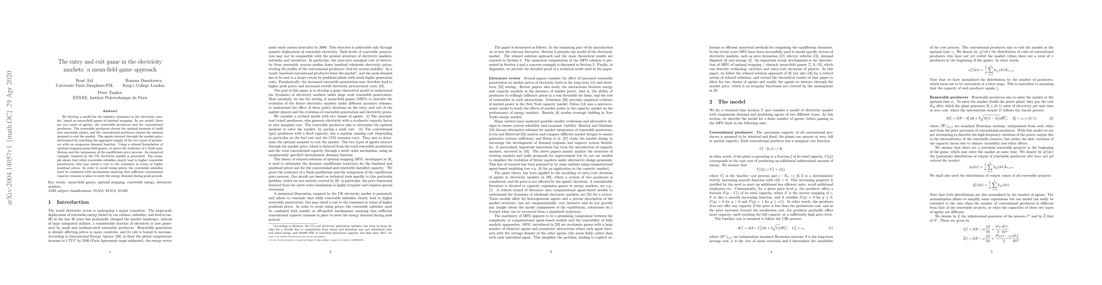 The approach combines mean-field game theory with optimal stopping problems to analyze strategic timing decisions in electricity markets, offering a novel perspective on industry dynamics under renewable energy integration.