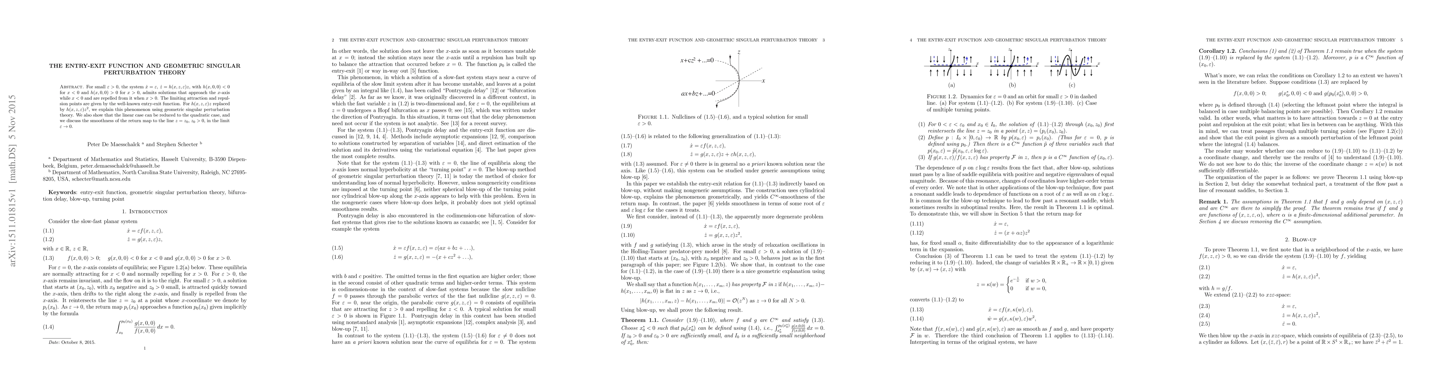 This paper uses geometric singular perturbation theory to explain how a system with small parameter epsilon exhibits solutions that approach or repel from the x-axis based on the sign of h(x,z_epsilon)z. It also discusses the smoothness of the return map to the line z=z0 in the limit epsilon -> 0.