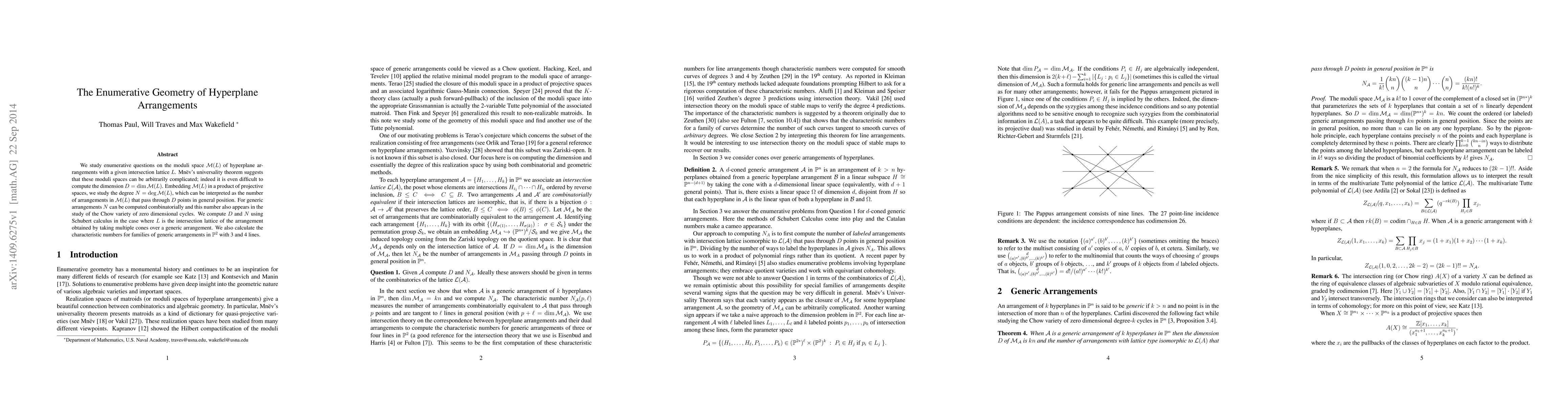 This paper investigates enumerative geometry for moduli spaces of hyperplane arrangements with a specified intersection lattice $L$, computing their dimensions and degrees using Schubert calculus, and calculating characteristic numbers for arrangements in $\mathbb{P}^2$ with 3 and 4 lines.
