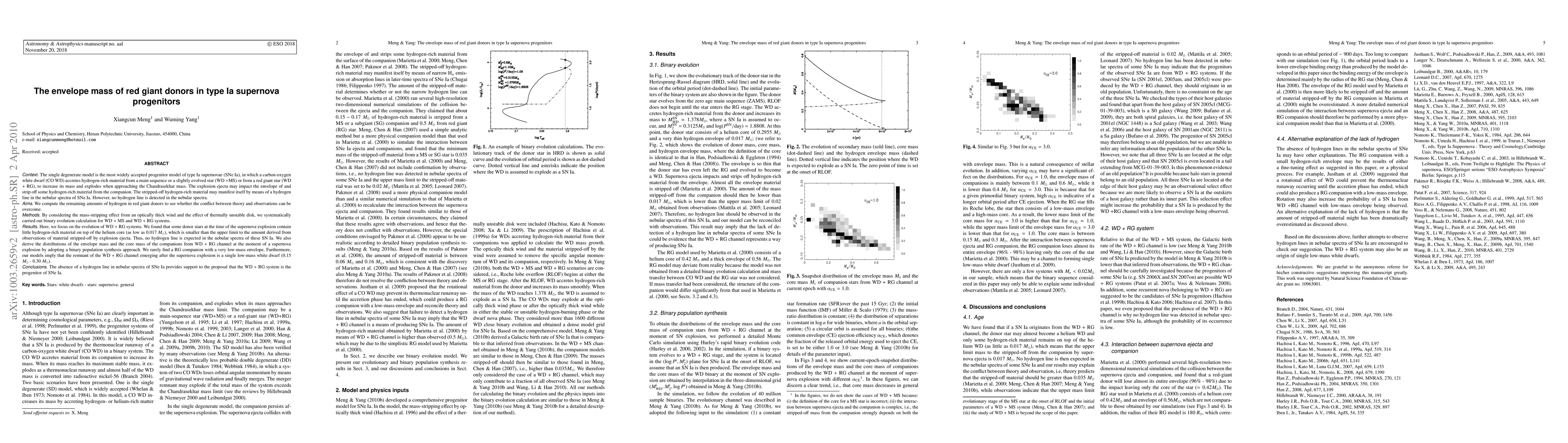 We compute the remaining amounts of hydrogen in red giant donors to see whether the conflict between theory and observations can be overcome. By considering the mass-stripping effect from an optically thick wind and the effect of thermally unstable disk, we systematically carried out binary evolution calculation for WD + MS and WD + RG systems. Here, we focus on the evolution of WD + RG systems. We found that some donor stars at the time of the supernova explosion contain little hydrogen-rich material on top of the helium core (as low as 0.017 $M_{\odot}$), which is smaller than the upper limit to the amount derived from observations of material stripped-off by explosion ejecta. Thus, no hydrogen line is expected in the nebular spectra of these SN Ia. We also derive the distributions of the envelope mass and the core mass of the companions from WD + RG channel at the moment of a supernova explosion by adopting a binary population synthesis approach. We rarely find a RG companion with a very low-mass envelope. Furthermore, our models imply that the remnant of the WD + RG channel emerging after the supernova explosion is a single low-mass white dwarf (0.15 $M_{\odot}$ - 0.30 $M_{\odot}$). The absence of a hydrogen line in nebular spectra of SNe Ia provides support to the proposal that the WD + RG system is the progenitor of SNe Ia.