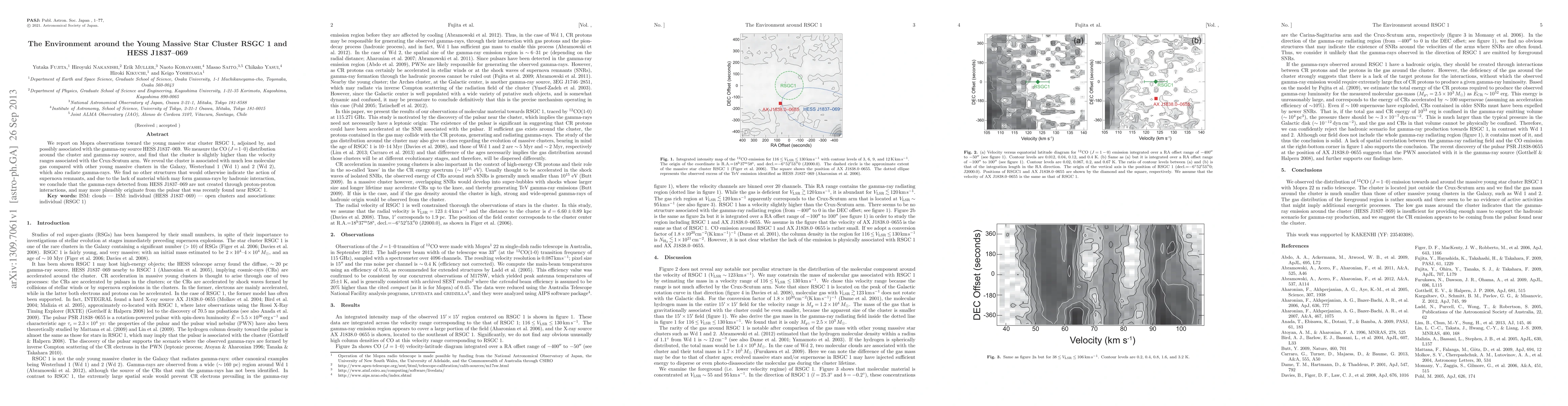 This study uses Mopra observations to analyze the CO distribution around the young massive star cluster RSGC 1, which may be linked to the gamma-ray source HESS J1837-069. The findings suggest that RSGC 1 has significantly less molecular gas than other gamma-ray-emitting clusters and likely does not host supernova remnants, indicating that the gamma-rays may originate from a nearby pulsar rather than hadronic interactions.