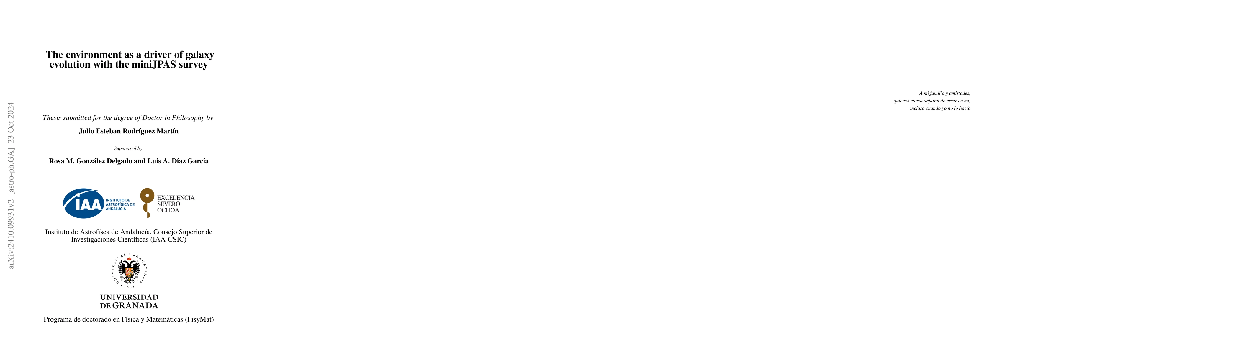 This thesis aims at discerning the effect of environment on galaxy evolution and on the properties of galaxies, using the data from the miniJPAS survey, a 1~deg$^2$ survey that uses the same photometric filter system as the incoming J-PAS survey, which is already in its scientific verification phase. This system is composed of 56 narrow-band filters that provide an spectral resolution comparable to low-resolution spectroscopy. We study the effect of environment using two approaches. First, we study the spatially resolved galaxies from miniJPAS. Secondly, we studied the galaxy population in the most massive galaxy cluster detected in the miniJPAS footprint, that is, the cluster mJPC2470-1771. We have developed a tool that automatises all the required processes for the analysis of the data. After probing the accuracy and reliability of the photmetry obtained with our tool, we apply it to a miniJPAS sample of spatially resolved galaxies, divided into four sub-samples according to their spectral-type (red/quiescent and blue/star forming), and environment (field or galaxy group). We find that redder, denser regions are usually older, more metal rich, and show lower values of the intensity of the star formation rate and the specific star formation rate than bluer and less dense regions. Regarding the mJPC2470-1771 cluster, our results point that more massive, redder and older galaxies typically populate the inner regions of the cluster. As a conclusion, our results suggest that galaxies in clusters are formed at a similar epoch, but have experienced different star formation histories. We conclude that the environment plays a role on galaxy evolution, but it is mainly reflected through the galaxy populations found in high density environments, such as galaxy clusters and groups, where the fraction of red, quiescent galaxies is larger in comparison to the field.