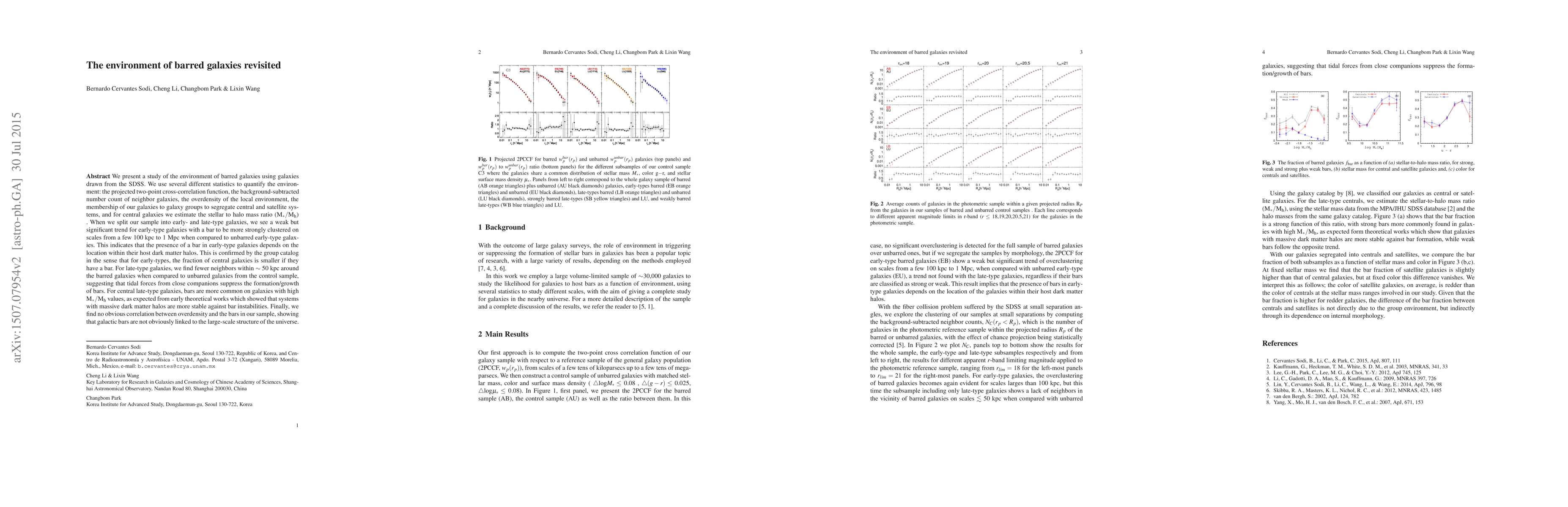 We present a study of the environment of barred galaxies using galaxies drawn from the SDSS. We use several different statistics to quantify the environment: the projected two-point cross-correlation function, the background-subtracted number count of neighbor galaxies, the overdensity of the local environment, the membership of our galaxies to galaxy groups to segregate central and satellite systems, and for central galaxies we estimate the stellar to halo mass ratio (M$_{\mathrm{*}}/$M$_{\mathrm{h}}$) . When we split our sample into early- and late-type galaxies, we see a weak but significant trend for early-type galaxies with a bar to be more strongly clustered on scales from a few 100 kpc to 1 Mpc when compared to unbarred early-type galaxies. This indicates that the presence of a bar in early-type galaxies depends on the location within their host dark matter halos. This is confirmed by the group catalog in the sense that for early-types, the fraction of central galaxies is smaller if they have a bar. For late-type galaxies, we find fewer neighbors within $\sim50$ kpc around the barred galaxies when compared to unbarred galaxies from the control sample, suggesting that tidal forces from close companions suppress the formation/growth of bars. For central late-type galaxies, bars are more common on galaxies with high M$_{\mathrm{*}}/$M$_{\mathrm{h}}$ values, as expected from early theoretical works which showed that systems with massive dark matter halos are more stable against bar instabilities. Finally, we find no obvious correlation between overdensity and the bars in our sample, showing that galactic bars are not obviously linked to the large-scale structure of the universe.