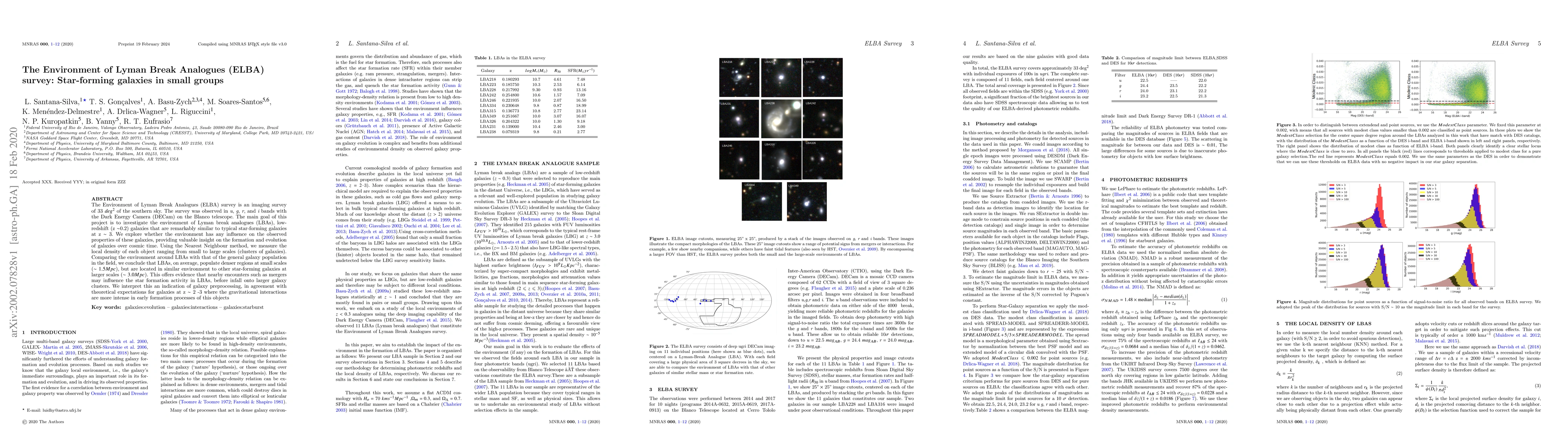 The Environment of Lyman Break Analogues (ELBA) survey is an imaging survey of 33 $deg^{2}$ of the southern sky. The survey was observed in {\it u}, {\it g}, {\it r}, and {\it i} bands with the Dark Energy Camera (DECam) on the Blanco telescope. The main goal of this project is to investigate the environment of Lyman break analogues (LBAs), low-redshift (z $\sim $0.2) galaxies that are remarkably similar to typical star-forming galaxies at z $\sim$ 3. We explore whether the environment has any influence on the observed properties of these galaxies, providing valuable insight on the formation and evolution of galaxies over cosmic time. Using the Nearest Neighbour method, we measure the local density of each object ranging from small to large scales (clusters of galaxies). Comparing the environment around LBAs with that of the general galaxy population in the field, we conclude that LBAs, on average, populate denser regions at small scales ($\sim$ $1.5Mpc$), but are located in similar environment to other star-forming galaxies at larger scales ($\sim$ $3.0 Mpc$). This offers evidence that nearby encounters such as mergers may influence the star formation activity in LBAs, before infall onto larger galaxy clusters. We interpret this an indication of galaxy preprocessing, in agreement with theoretical expectations for galaxies at z $\sim$ 2 -3 where the gravitational interactions are more intense in early formation processes of this objects
