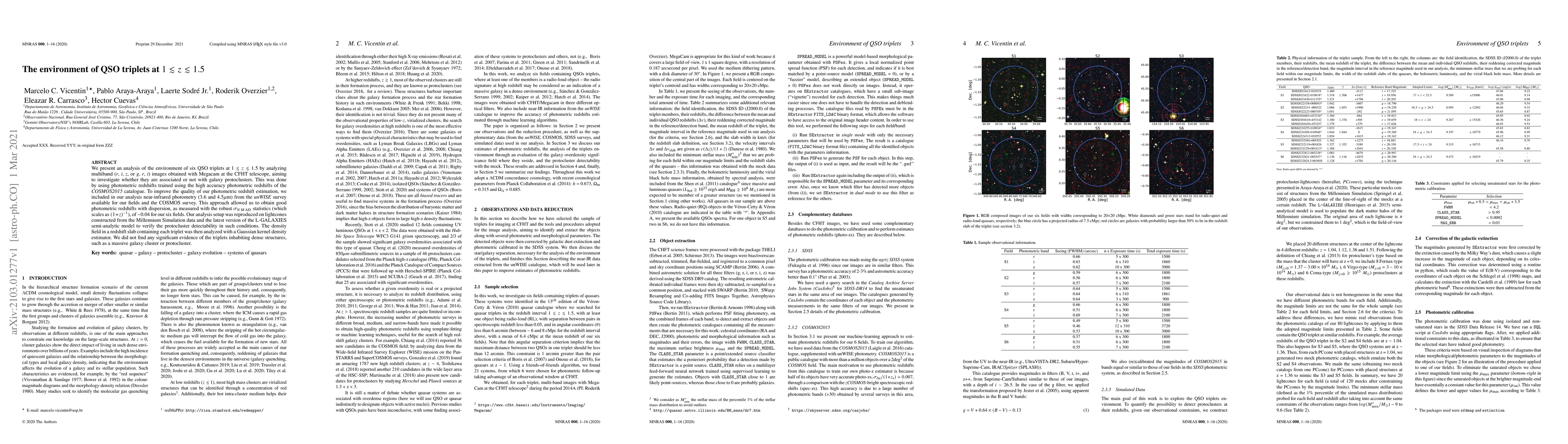 We present an analysis of the environment of six QSO triplets at 1 $\lesssim$ z $\lesssim$ 1.5 by analyzing multiband (r,i,z, or g,r,i) images obtained with Megacam at the CFHT telescope, aiming to investigate whether they are associated or not with galaxy protoclusters. This was done by using photometric redshifts trained using the high accuracy photometric redshifts of the COSMOS2015 catalogue. To improve the quality of our photometric redshift estimation, we included in our analysis near-infrared photometry (3.6 and 4.5 $\mu m$) from the unWISE survey available for our fields and the COSMOS survey. This approach allowed us to obtain good photometric redshifts with dispersion, as measured with the robust Sigma NMAD statistics of $\sim$ 0.04 for our six fields. Our analysis setup was reproduced on lightcones constructed from the Millennium Simulation data and the latest version of the L-GALAXIES semi-analytic model to verify the protocluster detectability in such conditions. The density field in a redshift slab containing each triplet was then analyzed with a Gaussian kernel density estimator. We did not find any significant evidence of the triplets inhabiting dense structures, such as a massive galaxy cluster or protocluster.