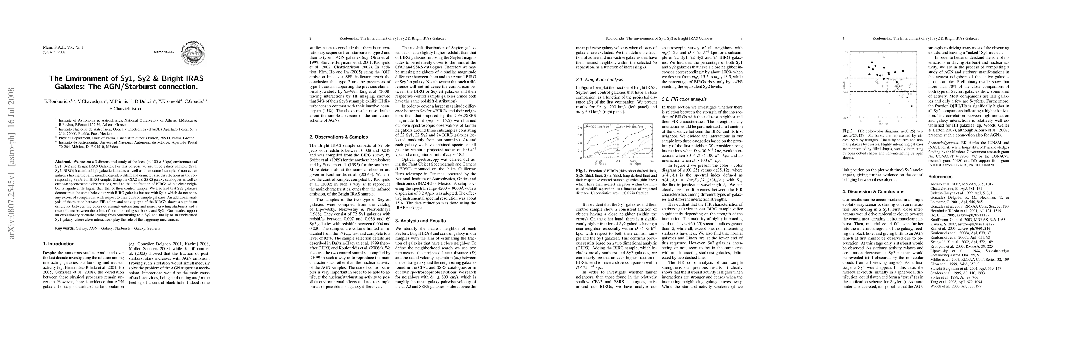 We present a 3-dimensional study of the local (< 100 kpc) environment of Sy1, Sy2 and Bright IRAS Galaxies. For this purpose we use three galaxy samples (Sy1, Sy2, BIRG) located at high galactic latitudes as well as three control sample of non-active galaxies having the same morphological, redshift and diameter size distributions as the corresponding Seyfert or BIRG sample. Using the CfA2 and SSRS galaxy catalogues as well as our own spectroscopic observations, we find that the fraction of BIRGs with a close neighbor is significantly higher than that of their control sample. We also find that Sy2 galaxies demonstrate the same behaviour with BIRG galaxies but not with Sy1s which do not show any excess of companions with respect to their control sample galaxies. An additional analysis of the relation between FIR colors and activity type of the BIRG's shows a significant difference between the colors of strongly-interacting and non-interacting starbursts and a resemblance between the colors of non-interacting starbursts and Sy2s.Our results support an evolutionary scenario leading from Starbursting to a Sy2 and finally to an unobscured Sy1 galaxy, where close interactions play the role of the triggering mechanism.