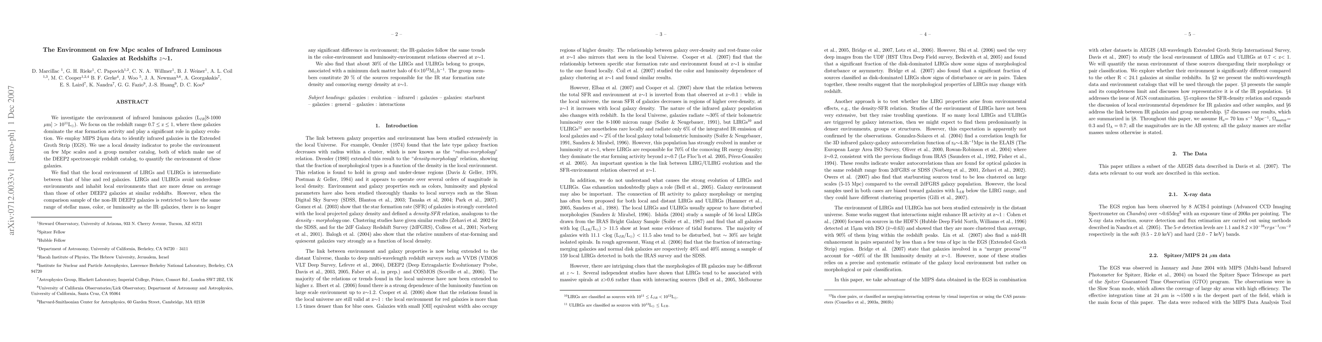 We investigate the environment of infrared luminous galaxies (L$_{IR}$[8-1000 $\mu $m$] >10^{11}$L$_{\sun}$). We focus on the redshift range 0.7 $\leq$ z $\leq$ 1, where these galaxies dominate the star formation activity and play a significant role in galaxy evolution. We employ MIPS 24$\mu$m data to identify infrared galaxies in the Extended Groth Strip (EGS). We use a local density indicator to probe the environment on few Mpc scales and a group member catalog, both of which make use of the DEEP2 spectroscopic redshift catalog, to quantify the environment of these galaxies. We find that the local environment of LIRGs and ULIRGs is intermediate between that of blue and red galaxies. LIRGs and ULIRGs avoid underdense environments and inhabit local environments that are more dense on average than those of other DEEP2 galaxies at similar redshifts. However, when the comparison sample of the non-IR DEEP2 galaxies is restricted to have the same range of stellar mass, color, or luminosity as the IR--galaxies, there is no longer any significant difference in environment; the IR-galaxies follow the same trends in the color-environment and luminosity-environment relations observed at z$\sim$1. We also find that about 30% of the LIRGs and ULIRGs belong to groups, associated with a minimum dark matter halo of 6$\times10^{12}$M$_{\odot}$h$^{-1}$. The group members constitute 20 % of the sources responsible for the IR star formation rate density and comoving energy density at z$\sim$1.
