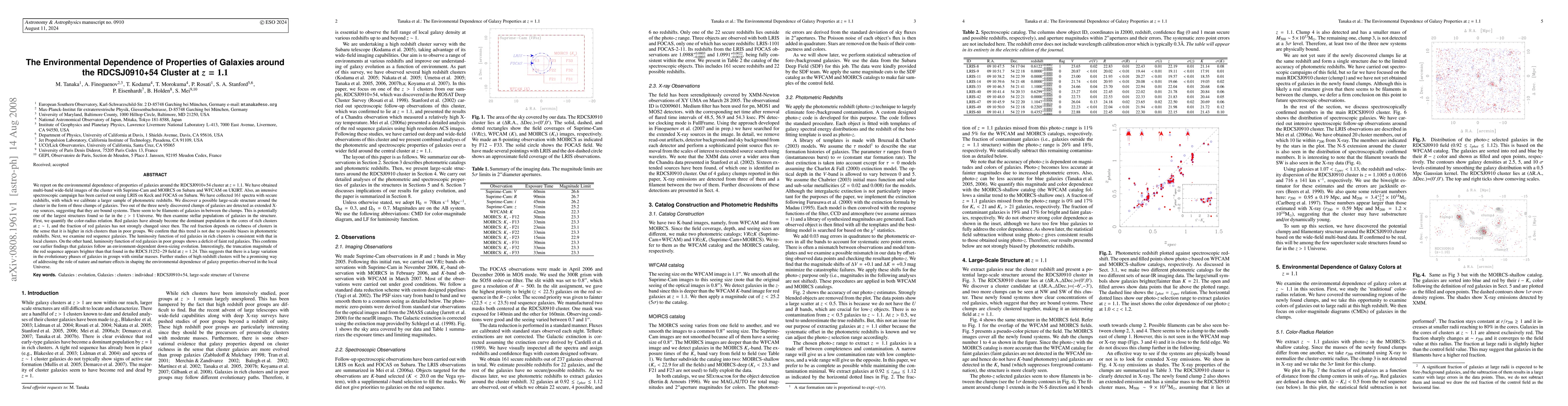 (Abridged) We report on the environmental dependence of properties of galaxies around the RDCSJ0910+54 cluster at z=1.1. We have obtained multi-band wide-field images of the cluster with Suprime-Cam and MOIRCS on Subaru and WFCAM on UKIRT. Also, an intensive spectroscopic campaign has been carried out using LRIS on Keck and FOCAS on Subaru. We discover a possible large-scale structure around the cluster in the form of three clumps of galaxies. This is potentially one of the largest structures found so far in the z>1 Universe. We then examine stellar populations of galaxies in the structure. Red galaxies have already become the dominant population in the cores of rich clusters at z~1, and the fraction of red galaxies has not strongly changed since then. The red fraction depends on richness of clusters in the sense that it is higher in rich clusters than in poor groups. The luminosity function of red galaxies in rich clusters is consistent with that in local clusters. On the other hand, luminosity function of red galaxies in poor groups shows a deficit of faint red galaxies. This confirms our earlier findings that galaxies follow an environment-dependent down-sizing evolution. There seems to be a large variation in the evolutionary phases of galaxies in groups with similar masses. Further studies of high-z clusters will be a promising way of addressing the role of nature and nurture effects on galaxy evolution.