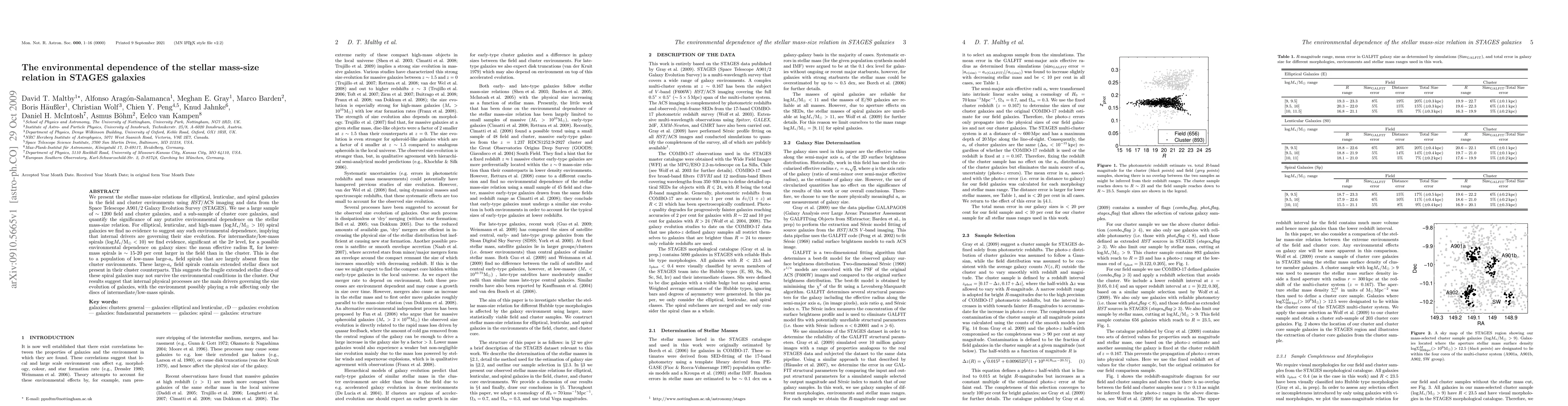 This study investigates the stellar mass-size relations for various galaxy types in both field and cluster environments using the STAGES survey data. It finds no significant environmental dependence for elliptical, lenticular, and high-mass spiral galaxies, while intermediate/low-mass spirals show a 15-20% larger size in the field, suggesting environmental conditions may affect the extended stellar discs of these galaxies.