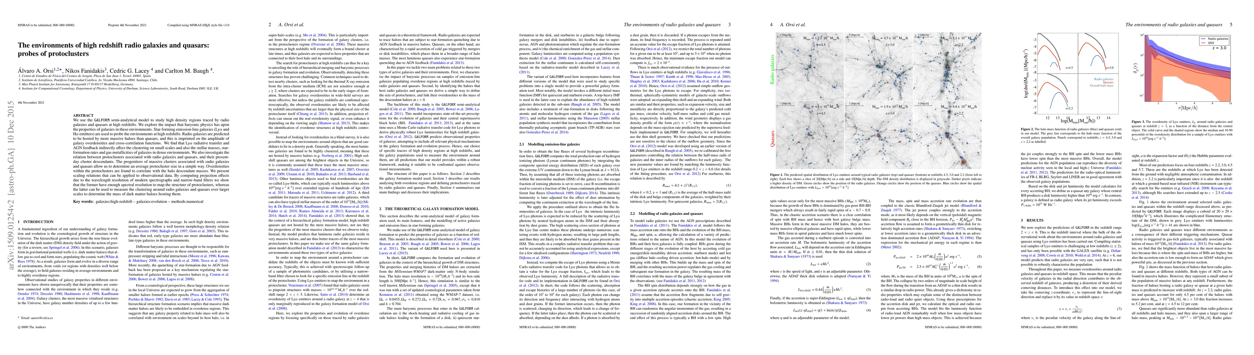 This paper uses the GALFORM model to investigate high-density regions at high redshifts, focusing on the environments of radio galaxies and quasars. It finds that baryonic physics influences galaxy properties in these regions, with radio galaxies residing in more massive haloes than quasars, affecting galaxy overdensities and cross-correlation functions.