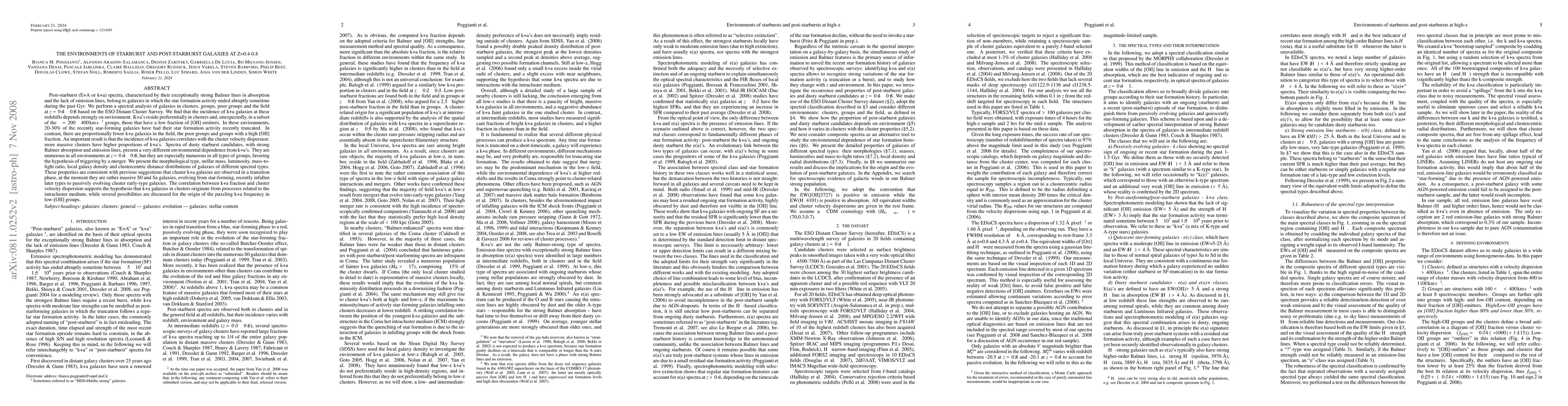 The study examines post-starburst galaxies (k+a's) at z=0.4-0.8, finding their occurrence is linked to galaxy environment, being more prevalent in clusters and specific low-[OII] groups, unlike dusty starburst candidates. The findings suggest k+a galaxies may evolve from star-forming to early-type galaxies under cluster conditions, influenced by the intracluster medium. The research methodology is based on spectral analysis from the ESO Distant Cluster Survey.