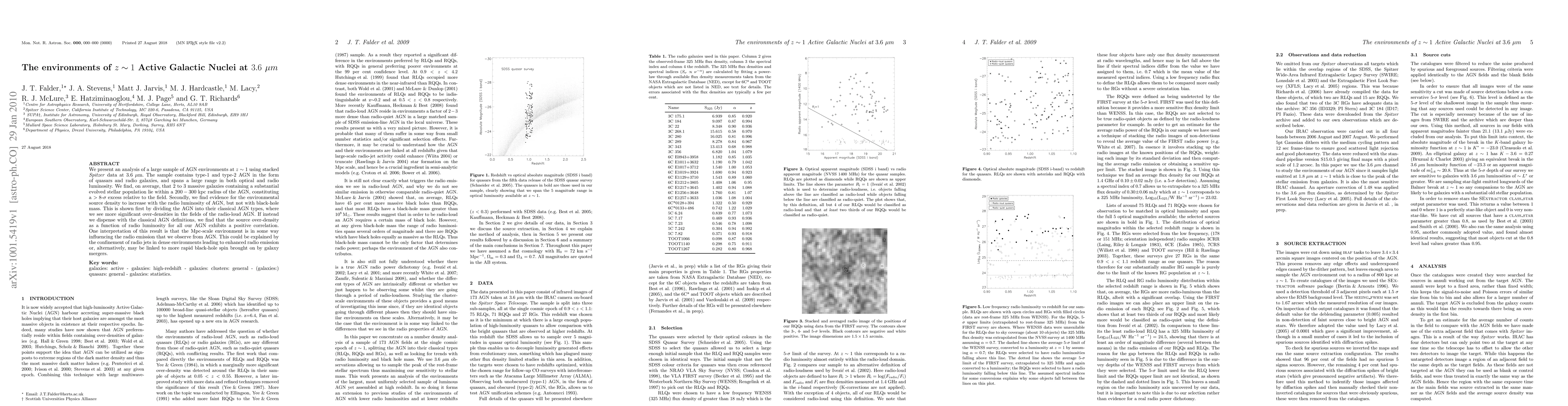 We present an analysis of a large sample of AGN environments at z~1 using stacked Spitzer data at 3.6um. The sample contains type-1 and type-2 AGN in the form of quasars and radio galaxies, and spans a large range in both optical and radio luminosity. We find, on average, that 2 to 3 massive galaxies containing a substantial evolved stellar population lie within a 200-300 kpc radius of the AGN, constituting a >8-sigma excess relative to the field. Secondly, we find evidence for the environmental source density to increase with the radio luminosity of AGN, but not with black-hole mass. This is shown first by dividing the AGN into their classical AGN types, where we see more significant over-densities in the fields of the radio-loud AGN. If instead we dispense with the classical AGN definitions, we find that the source over-density as a function of radio luminosity for all our AGN exhibits a positive correlation. One interpretation of this result is that the Mpc-scale environment is in some way influencing the radio emission that we observe from AGN. This could be explained by the confinement of radio jets in dense environments leading to enhanced radio emission or, alternatively, may be linked to more rapid black-hole spin brought on by galaxy mergers.