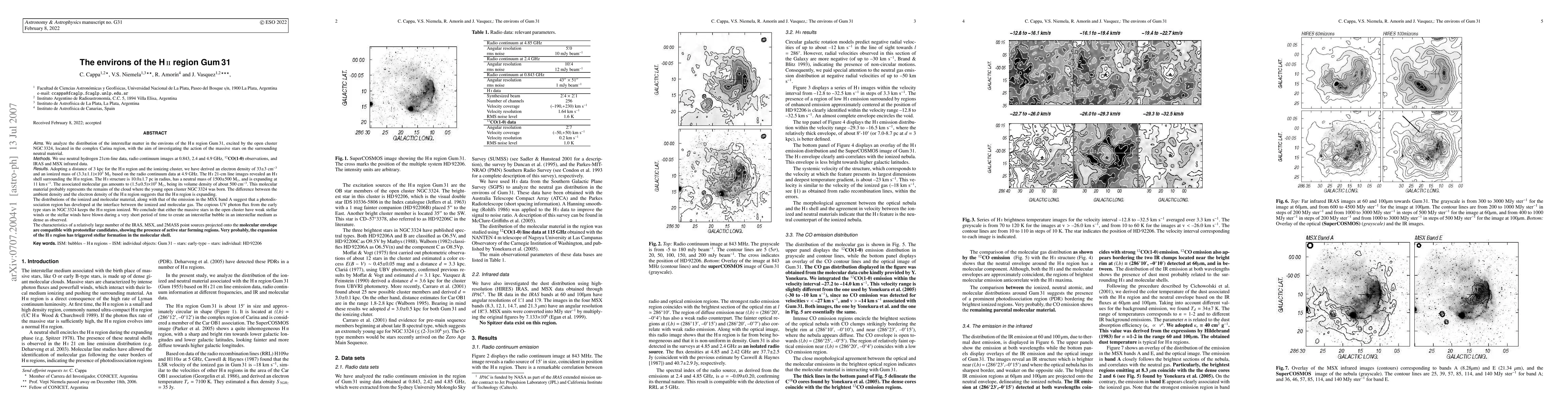 We analyze the distribution of the interstellar matter in the environs of the \hii region Gum 31, excited by the open cluster NGC 3324, located in the complex Carina region, with the aim of investigating the action of the massive stars on the surrounding neutral material. We use 21cm-line data, radio continuum images at 0.843, 2.4 and 4.9 GHz, $^{12}${\bf CO(1-0)} observations, and IRAS and MSX infrared data. Adopting a distance of 3 kpc for the \hii\ region and the ionizing cluster, we have derived an electron density of 33$\pm$3 cm$^{-3}$ and an ionized mass of (3.3$\pm$1.1)$\times10^3$ M$_{\odot}$ based on the radio continuum data at 4.9 GHz. The \hi 21-cm line images revealed an \hi shell surrounding the H {\sc ii} region. The \hi structure is 10.0$\pm$1.7 pc in radius, has a neutral mass of 1500$\pm$500 M$_{\odot}$, and is expanding at 11 km s$^{-1}$. The associated molecular gas amounts to (1.5$\pm$0.5)$\times10^5$ M$_{\odot}$, being its volume density of about 500 cm^{-3}. This molecular material probably represents the remains of the cloud where the young open cluster NGC 3324 was born. The distributions of the ionized and molecular material, along with that of the emission in the MSX band A suggest that a photodissociation region has developed at the interface between the ionized and molecular gas. We conclude that either the massive stars in the open cluster have weak stellar winds or the stellar winds have blown during a very short period of time to create an interstellar bubble in an interstellar medium as dense as observed. IRAS, MSX, and 2MASS point sources projected onto the molecular envelope are compatible with protostellar candidates, showing the presence star forming regions. The expansion of the \hii region has triggered stellar formation in the molecular shell.
