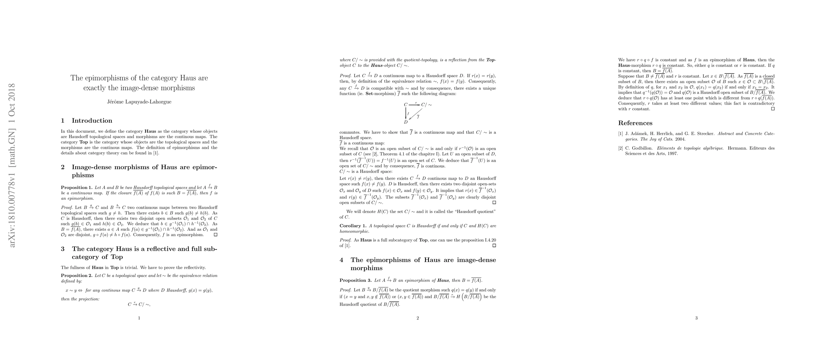 This document presents the proof that the epimorphisms of the category of Hausdorff spaces are exactly the image dense morphisms. While it is a classical result; its proof is difficult to find in internet. Consequently, I decided to write the proof on my way and to share my knowledge freely on Arxiv. This document can interest any student in Pure Mathematics in the topics of topology and category theory. The image-dense morphisms are clearly epimorphisms. To etablish the converse, I use an analogous to the Kolmogorov quotient that I call Hausdorff quotient. Thanks to this Hausdorff quotient, one can prove that the Haus-category is a reflective subcategory of the category of topological spaces. As it is also a full subcategory, we deduce a necessary and sufficient condition for a topological space to be Hausdorff. We use this condition to show that if a morphism f:A->B is not image-dense, then the Hausdorff quotient of the quotient B/cl(f(A)) has at least two points. Moreover, we show that if f is an epimorphism, the Hausdorff quotient of the quotient B/cl(f(A)) has at most one point. We deduce the result.