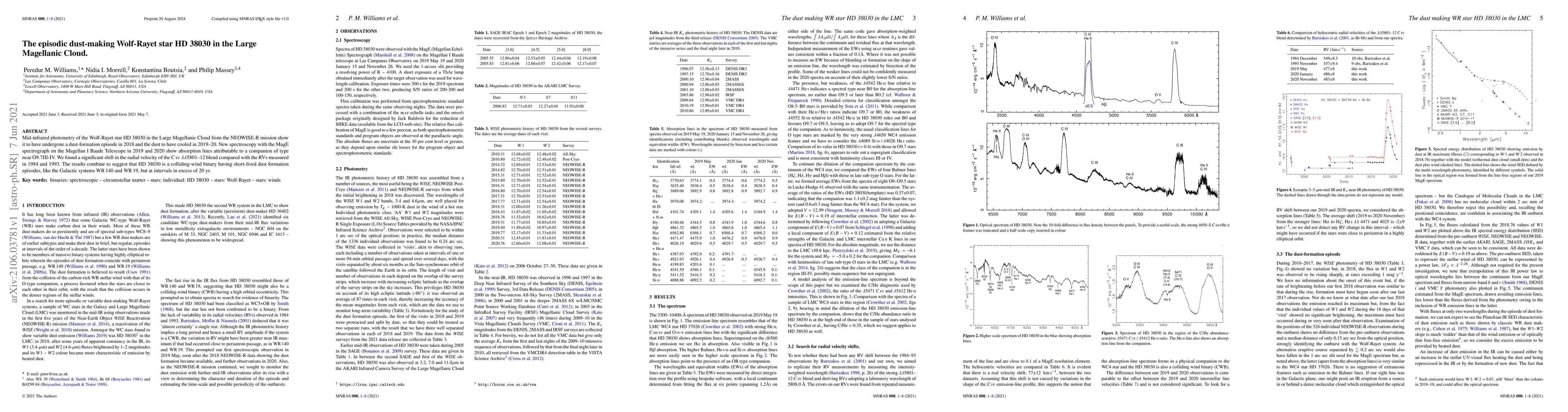 This study reveals that the Wolf-Rayet star HD 38030 in the Large Magellanic Cloud experienced a dust-formation episode in 2018, confirmed by mid-infrared photometry, and spectroscopy indicates it is part of a colliding-wind binary with a companion of type O9.7III-IV.