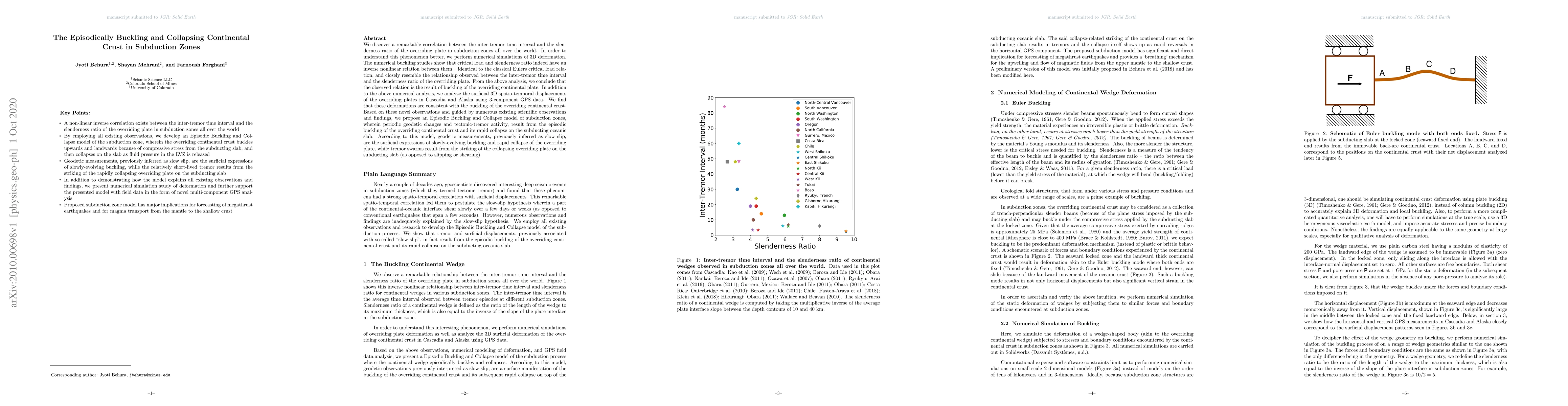 We discover a remarkable correlation between the inter-tremor time interval and the slenderness ratio of the overriding plate in subduction zones all over the world. In order to understand this phenomenon better, we perform numerical simulations of 3D deformation. The numerical buckling studies show that critical load and slenderness ratio indeed have an inverse nonlinear relation between them -- identical to the classical Euler's critical load relation, and closely resemble the relationship observed between the inter-tremor time interval and the slenderness ratio of the overriding plate. From the above analysis, we conclude that the observed relation is the result of buckling of the overriding continental plate. In addition to the above numerical analysis, we analyze the surficial 3D spatio-temporal displacements of the overriding plates in Cascadia and Alaska using 3-component GPS data. We find that these deformations are consistent with the buckling of the overriding continental crust. Based on these novel observations and guided by numerous existing scientific observations and findings, we propose an Episodic Buckling and Collapse model of subduction zones, wherein periodic geodetic changes and tectonic-tremor activity, result from the episodic buckling of the overriding continental crust and its rapid collapse on the subducting oceanic slab. According to this model, geodetic measurements, previously inferred as slow slip, are the surficial expressions of slowly-evolving buckling and rapid collapse of the overriding plate, while tremor swarms result from the striking of the collapsing overriding plate on the subducting slab (as opposed to slipping or shearing).