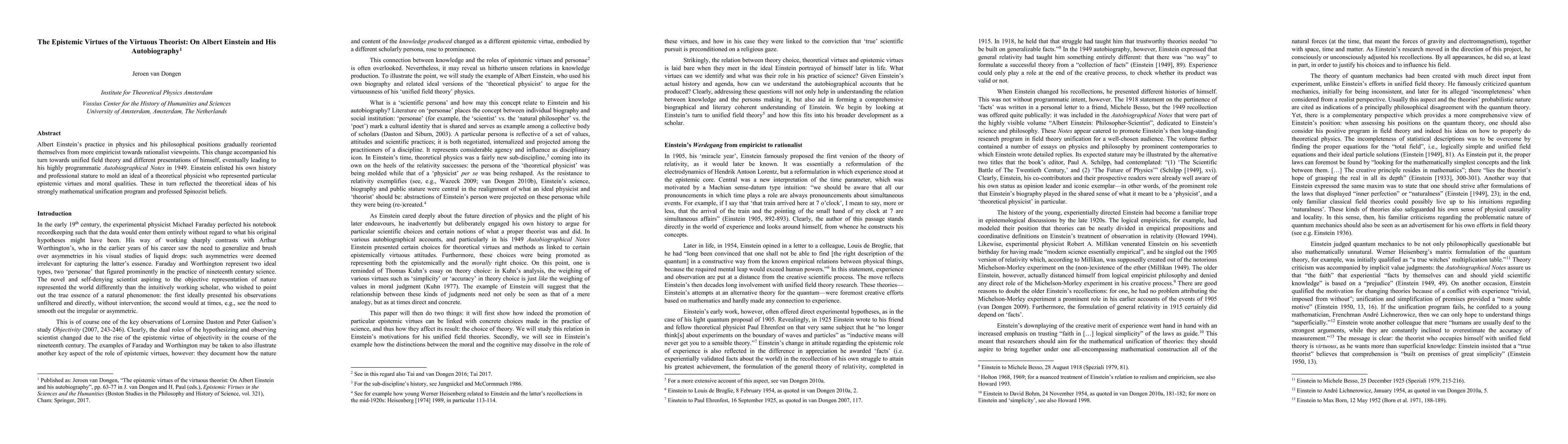 Summary: This paper explores how Albert Einstein's shift from empiricism to rationalism in physics influenced his philosophical self-presentation, culminating in his 1949 Autobiographical Notes, where he embodies an ideal theoretical physicist characterized by specific epistemic virtues and moral qualities aligned with his mathematical unification theories and Spinozist beliefs.