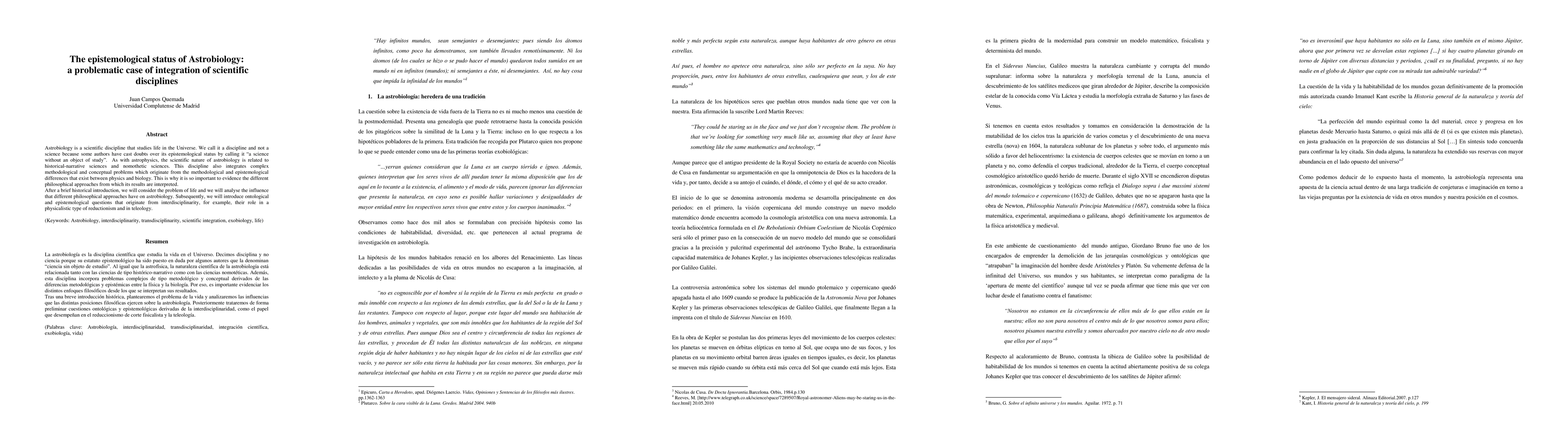This paper explores the epistemological status of astrobiology, questioning its classification as a science due to its lack of a defined object of study. It examines the integration challenges arising from the methodological and conceptual differences between physics and biology, and discusses the philosophical interpretations that shape its results.