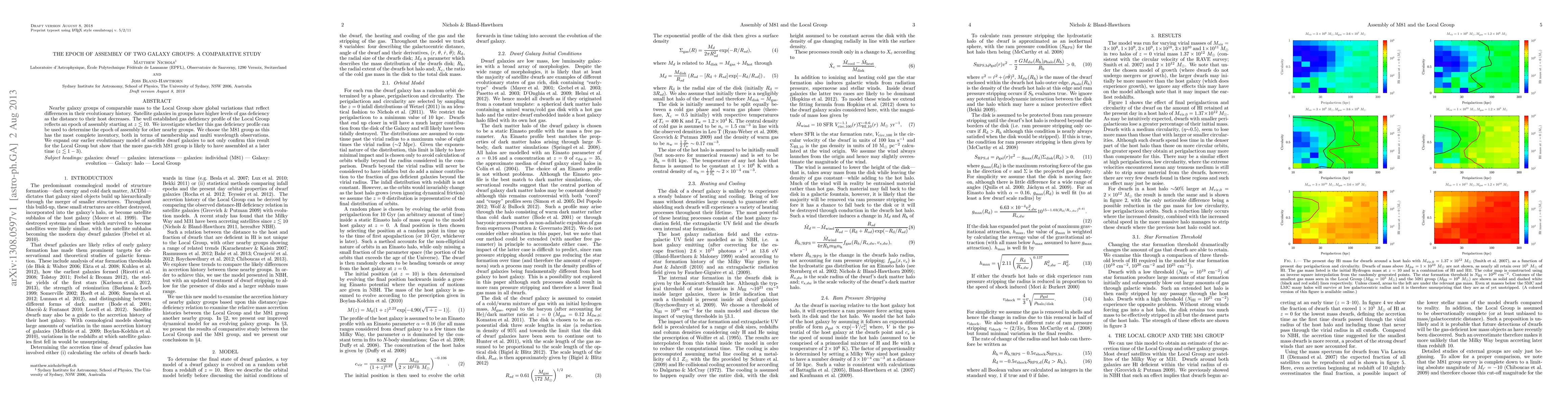 Nearby galaxy groups of comparable mass to the Local Group show global variations that reflect differences in their evolutionary history. Satellite galaxies in groups have higher levels of gas deficiency as the distance to their host decreases. The well established gas deficiency profile of the Local Group reflects an epoch of assembly starting at z<10. We investigate whether this gas deficiency profile can be used to determine the epoch of assembly for other nearby groups. We choose the M81 group as this has the most complete inventory, both in terms of membership and multi-wavelength observations. We expand our earlier evolutionary model of satellite dwarf galaxies to not only confirm this result for the Local Group but show that the more gas-rich M81 group is likely to have assembled at a later time (z<1-3).