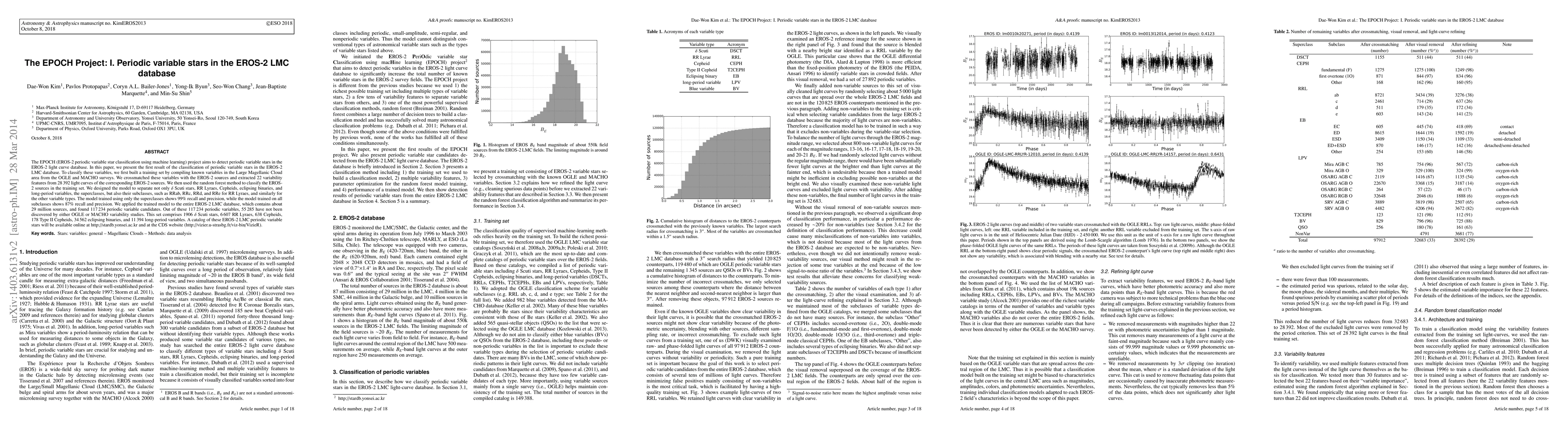 The EPOCH project employs machine learning to classify periodic variable stars in the EROS-2 Large Magellanic Cloud database, identifying 117,234 candidates, including 55,285 previously undiscovered variables, using a random forest model trained on features extracted from 28,392 light curves. The trained model distinguishes between various superclasses and subclasses of variable stars.