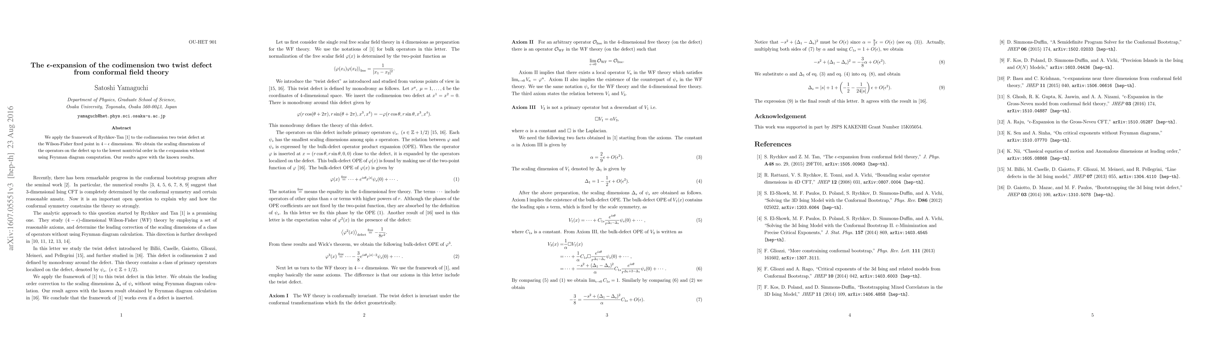 We apply the framework of Rychkov-Tan arXiv:1505.00963 to the codimension two twist defect at the Wilson-Fisher fixed point in $4-\epsilon$ dimensions. We obtain the scaling dimensions of the operators on the defect up to the lowest nontrivial order in the $\epsilon$-expansion without using Feynman diagram computation. Our results agree with the known results.