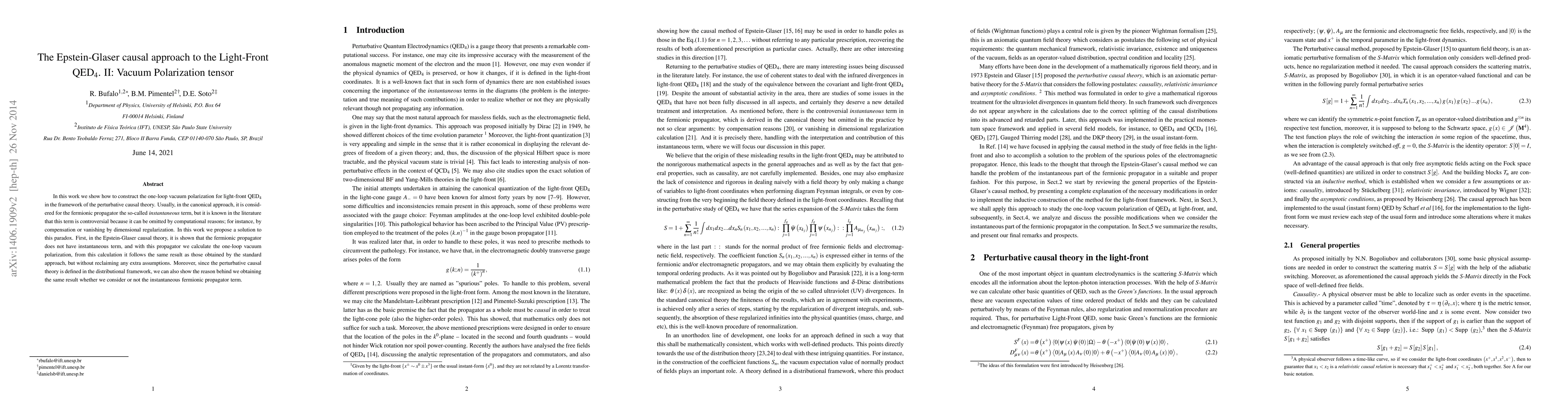 In this work we show how to construct the one-loop vacuum polarization for light-front QED$_{4}$ in the framework of the perturbative causal theory. Usually, in the canonical approach, it is considered for the fermionic propagator the so-called instantaneous term, but it is known in literature that this term is controversial because it can be omitted by computational reasons; for instance, by compensation or vanishing by dimensional regularization. In this work we propose a solution to this paradox. First, in the perturbative causal theory, it is shown that the fermionic propagator does not have instantaneous terms, and with this propagator we calculate the one-loop vacuum polarization, from the calculation it follows the same result as obtained by the standard approach, but without reclaiming any extra assumptions. Moreover, since the perturbative causal theory is defined in the distributional framework, we can also show the reason behind we obtaining the same result whether we consider or not the instantaneous fermionic propagator term.