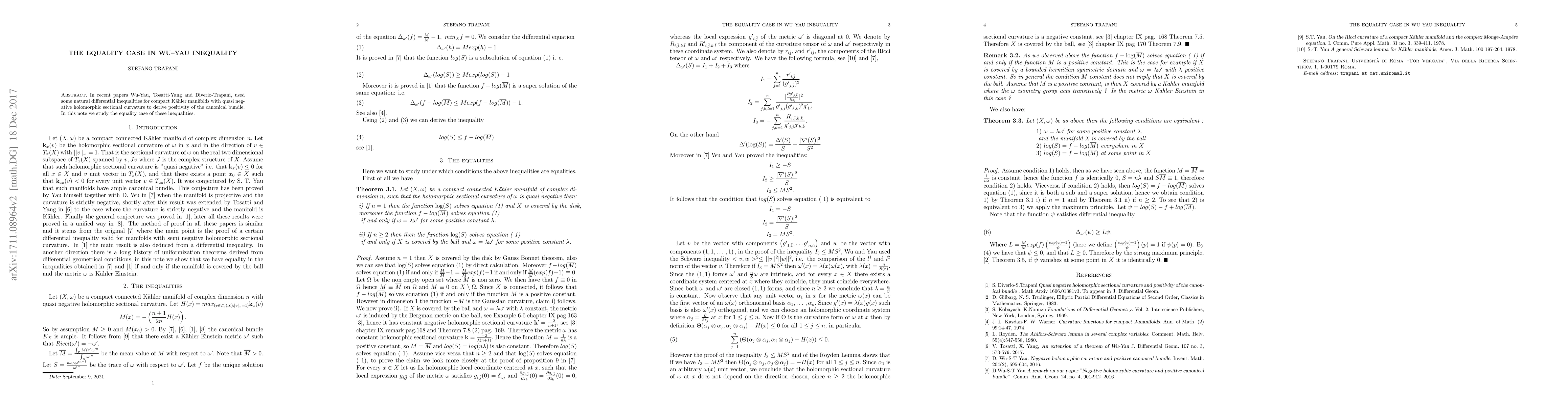 In recent papers Wu-Yau, Tosatti-Yang and Diverio-Trapani, used some natural differential inequalities for compact K\"ahler manifolds with quasi negative holomorphic sectional curvature to derive positivity of the canonical bundle. In this note we study the equality case of these inequalities.