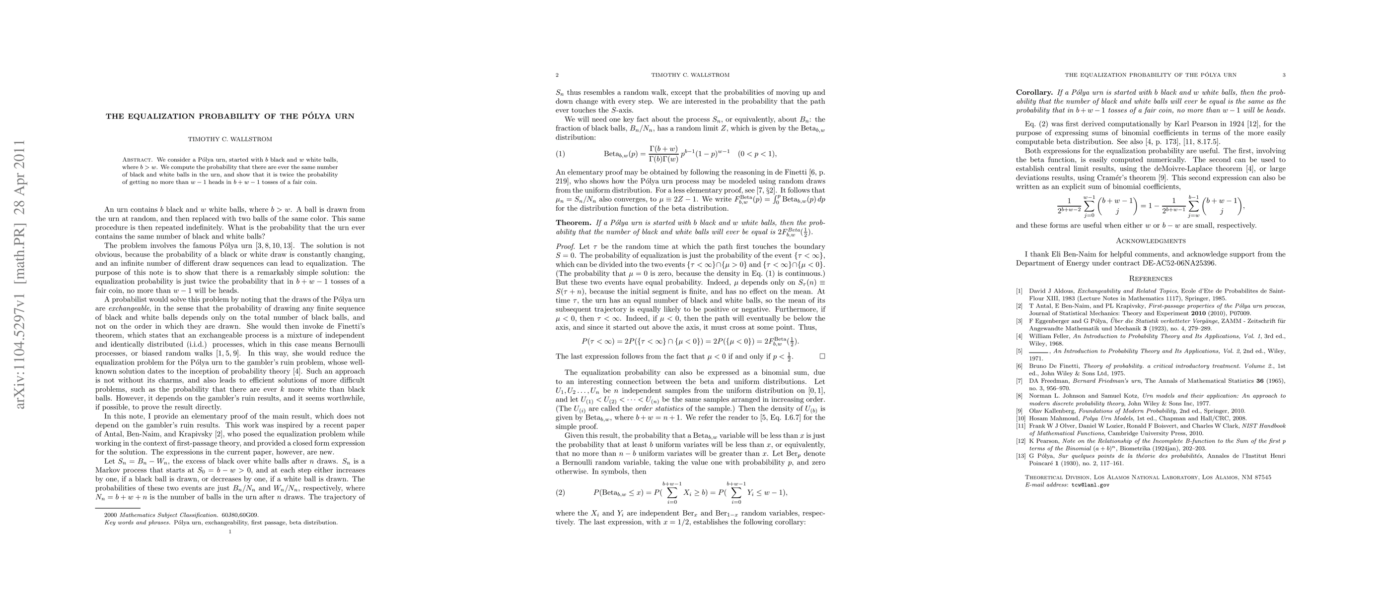 Summary: This paper investigates the equalization probability in a Polya urn model with more black than white balls, finding that the chance of equal numbers of black and white balls is twice the probability of obtaining no more than w-1 heads in b+w-1 fair coin tosses.