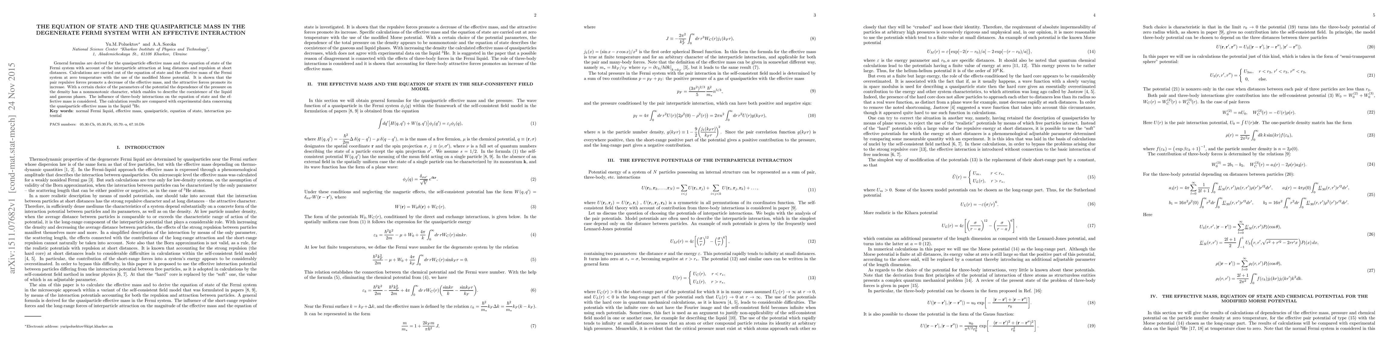 General formulas are derived for the quasiparticle effective mass and the equation of state of the Fermi system with account of the interparticle attraction at long distances and repulsion at short distances. Calculations are carried out of the equation of state and the effective mass of the Fermi system at zero temperature with the use of the modified Morse potential. It is shown that the pair repulsive forces promote a decrease of the effective mass, and the attractive forces promote its increase. With a certain choice of the parameters of the potential the dependence of the pressure on the density has a nonmonotonic character, which enables to describe the coexistence of the liquid and gaseous phases. The influence of three-body interactions on the equation of state and the effective mass is considered. The calculation results are compared with experimental data concerning the quasiparticle effective mass in the liquid $^3$He. Key words: normal Fermi liquid, effective mass, quasiparticle, equation of state, interaction potential