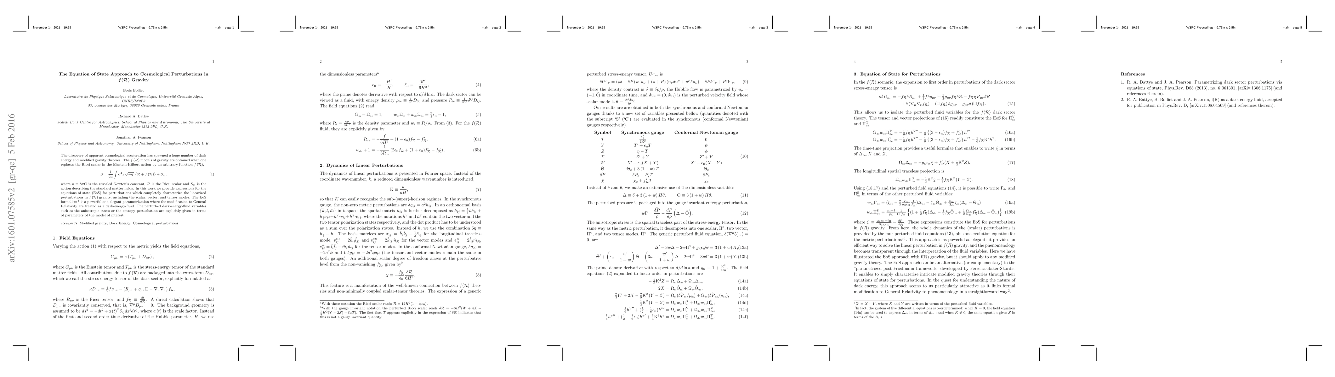 This paper develops equations of state for cosmological perturbations in f(R) gravity, providing a comprehensive characterization of linearized perturbations including scalar, vector, and tensor modes. The equations of state formalism treats modifications to General Relativity as a dark-energy-fluid, explicitly linking perturbed dark-energy variables to model parameters.