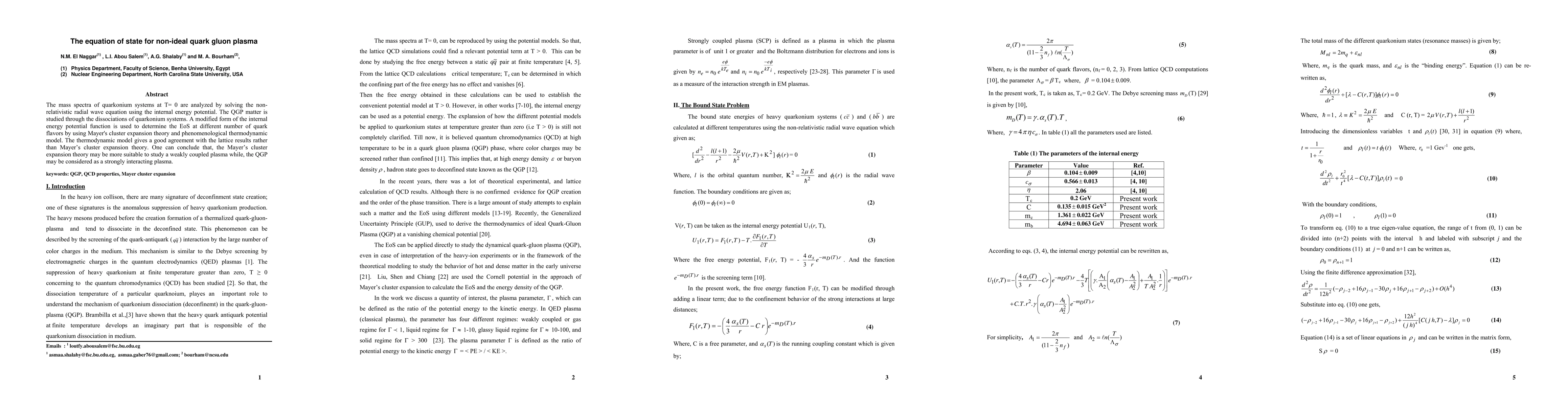 The mass spectra of quarkonium systems at temperature equal zero are analyzed by solving the non-relativistic radial wave equation using the internal energy potential. The QGP matter is studied through the dissociations of quarkonium systems. A modified form of the internal energy potential function is used to determine the EoS at different number of quark flavors by using Mayer s cluster expansion theory and phenomenological thermodynamic model. The thermodynamic model gives a good agreement with the lattice results rather than Mayer s cluster expansion theory. One can conclude that, the Mayer s cluster expansion theory may be more suitable to study a weakly coupled plasma while, the QGP may be considered as a strongly interacting plasma.