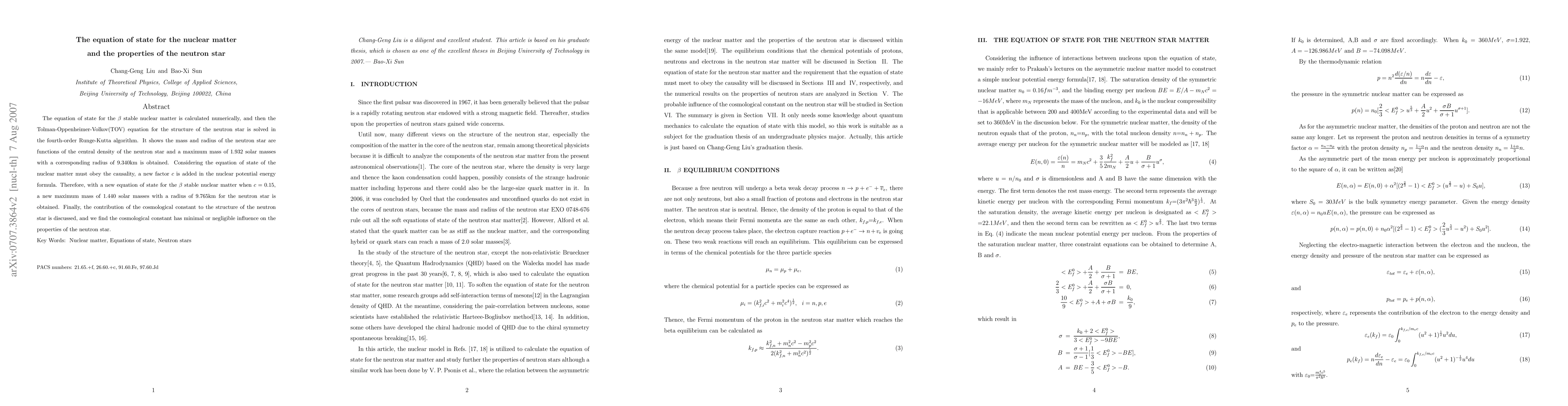This paper calculates the equation of state for beta stable nuclear matter and solves the Tolman-Oppenheimer-Volkov equation to determine neutron star properties, finding a maximum mass of 1.932 solar masses. It also introduces a new factor in the nuclear potential energy formula, resulting in a reduced maximum mass of 1.440 solar masses.
