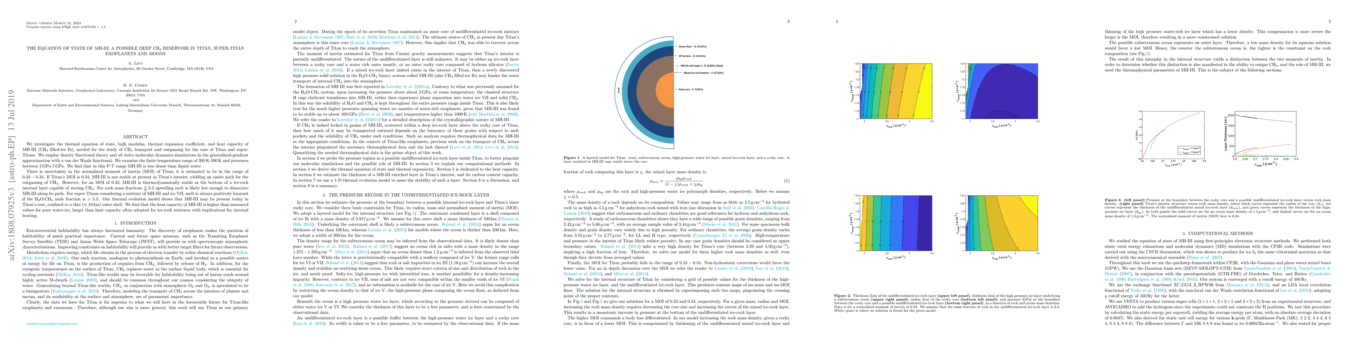 We investigate the thermal equation of state, bulk modulus, thermal expansion coefficient, and heat capacity of MH-III (CH$_4$ filled-ice Ih), needed for the study of CH$_4$ transport and outgassing for the case of Titan and super-Titans. We employ density functional theory and ab initio molecular dynamics simulations in the generalized-gradient approximation with a van der Waals functional. We examine the finite temperature range of $300$K-$500$K and pressures between $2$GPa-$7$GPa. We find that in this P-T range MH-III is less dense than liquid water. There is uncertainty in the normalized moment of inertia (MOI) of Titan; it is estimated to be in the range of $0.33-0.34$. If Titan's MOI is $0.34$, MH-III is not stable at present in Titan's interior, yielding an easier path for the outgassing of CH$_4$. However, for an MOI of $0.33$, MH-III is thermodynamically stable at the bottom of a ice-rock internal layer capable of storing CH$_4$. For rock mass fractions $\lessapprox 0.2$ upwelling melt is likely hot enough to dissociate MH-III along its path. For super-Titans considering a mixture of MH-III and ice VII, melt is always positively buoyant if the H$_2$O:CH$_4$ mole fraction is $>5.5$. Our thermal evolution model shows that MH-III may be present today in Titan's core, confined to a thin ($\approx 10$km) outer shell. We find that the heat capacity of MH-III is higher than measured values for pure water-ice, larger than heat capacity often adopted for ice-rock mixtures with implications for internal heating.