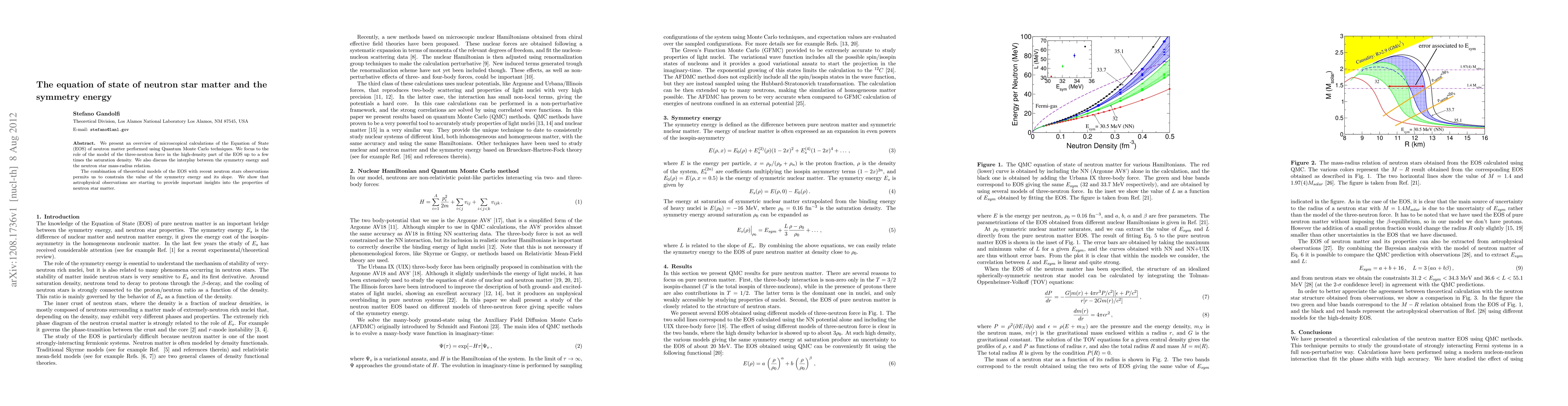This paper reviews microscopic calculations of the neutron star matter Equation of State (EOS) using Quantum Monte Carlo, emphasizing the role of three-neutron forces. It discusses the connection between symmetry energy and neutron star mass-radius relations, highlighting how theoretical models combined with recent observations can constrain the symmetry energy and its slope.