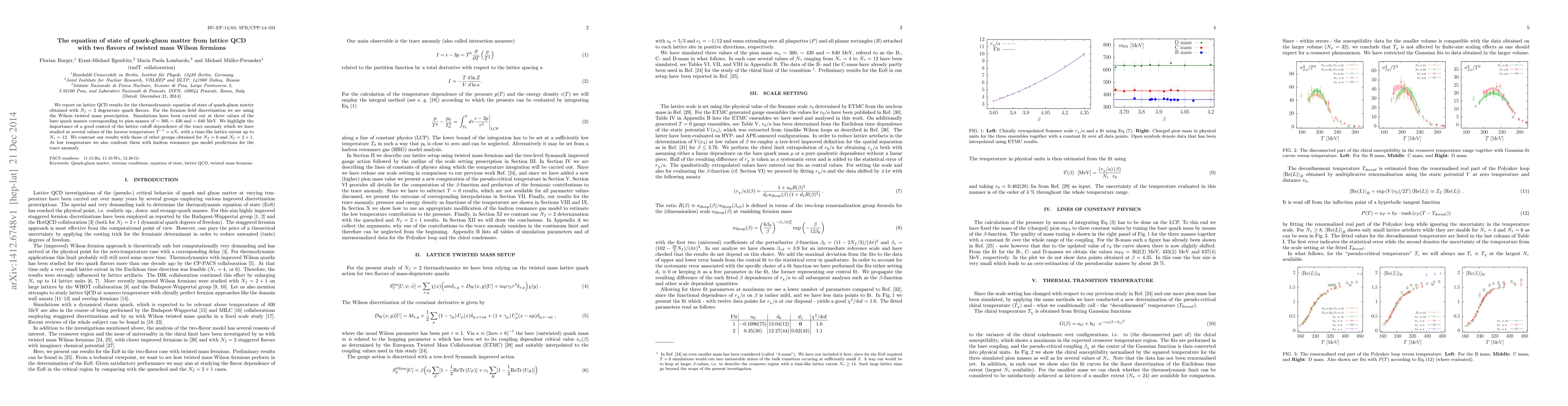 We report on lattice QCD results for the thermodynamic equation of state of quark-gluon matter obtained with Nf=2 degenerate quark flavors. For the fermion field discretization we are using the Wilson-twisted mass prescription. Simulations have been carried out at three values of the bare quark masses corresponding to pion masses of 360, 430 and 640 MeV. We highlight the importance of a good control of the lattice cutoff dependence of the trace anomaly which we have studied at several values of the inverse temperature 1/T = a Nt with a time-like lattice extent up to Nt=12. We contrast our results with those of other groups obtained for Nf=0 and Nf=2+1. At low temperature we also confront them with hadron resonance gas model predictions for the trace anomaly.