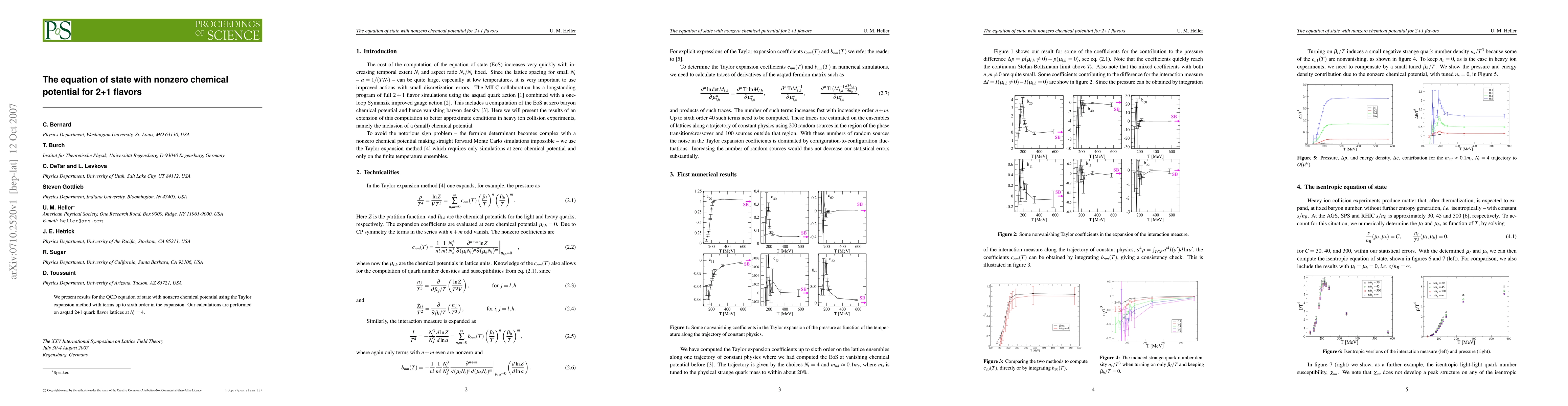 Summary: This study employs the Taylor expansion method to determine the QCD equation of state with nonzero chemical potential for 2+1 quark flavors on lattices with $N_t=4$, using terms up to sixth order in the expansion. The results are obtained on asqtad 2+1 flavor lattices.