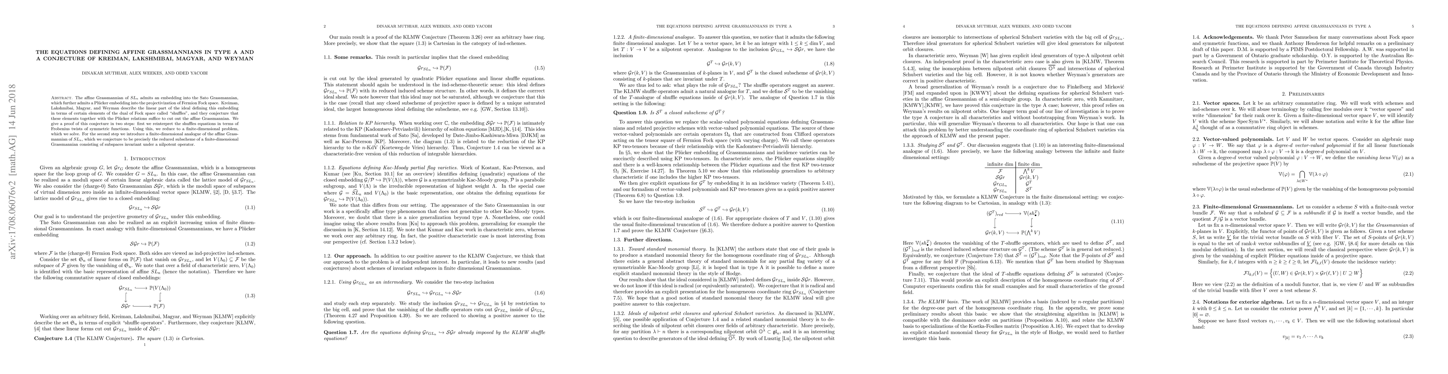 The affine Grassmannian of $SL_n$ admits an embedding into the Sato Grassmannian, which further admits a Pl\"ucker embedding into the projectivization of Fermion Fock space. Kreiman, Lakshmibai, Magyar, and Weyman describe the linear part of the ideal defining this embedding in terms of certain elements of the dual of Fock space called "shuffles", and they conjecture that these elements together with the Pl\"ucker relations suffice to cut out the affine Grassmannian. We give a proof of this conjecture in two steps: first we reinterpret the shuffles equations in terms of Frobenius twists of symmetric functions. Using this, we reduce to a finite dimensional-problem, which we solve. For the second step we introduce a finite-dimensional analogue of the affine Grassmannians of $SL_n$, which we conjecture to be precisely the reduced subscheme of a finite-dimensional Grassmannian consisting of subspaces invariant under a nilpotent operator.