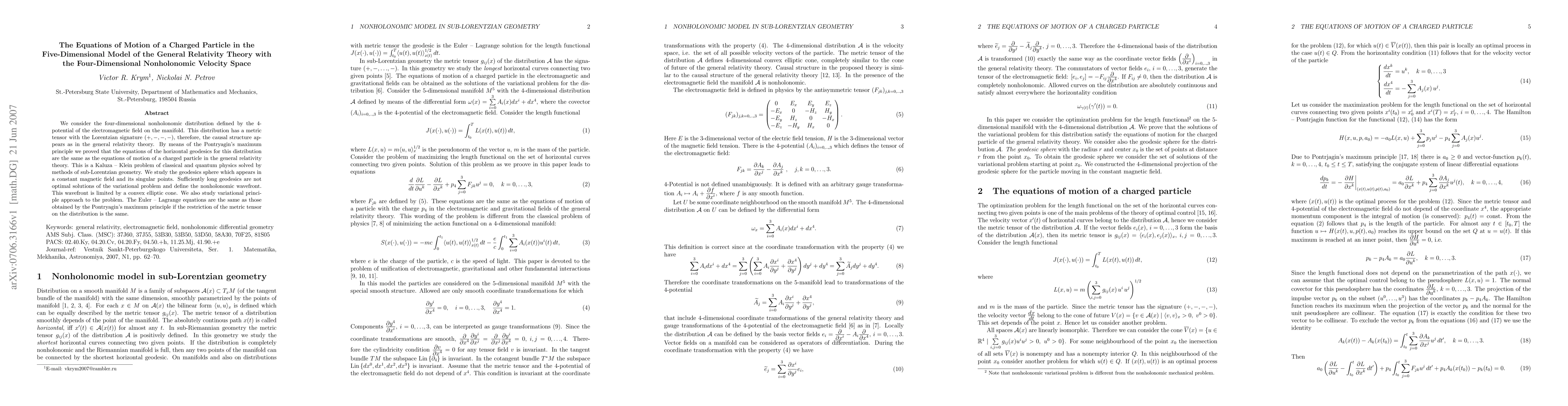 We consider the four-dimensional nonholonomic distribution defined by the 4-potential of the electromagnetic field on the manifold. This distribution has a metric tensor with the Lorentzian signature $(+,-,-,-)$, therefore, the causal structure appears as in the general relativity theory. By means of the Pontryagin's maximum principle we proved that the equations of the horizontal geodesics for this distribution are the same as the equations of motion of a charged particle in the general relativity theory. This is a Kaluza -- Klein problem of classical and quantum physics solved by methods of sub-Lorentzian geometry. We study the geodesics sphere which appears in a constant magnetic field and its singular points. Sufficiently long geodesics are not optimal solutions of the variational problem and define the nonholonomic wavefront. This wavefront is limited by a convex elliptic cone. We also study variational principle approach to the problem. The Euler -- Lagrange equations are the same as those obtained by the Pontryagin's maximum principle if the restriction of the metric tensor on the distribution is the same.